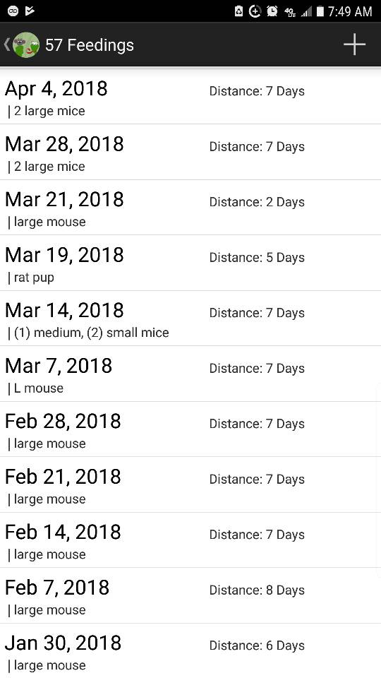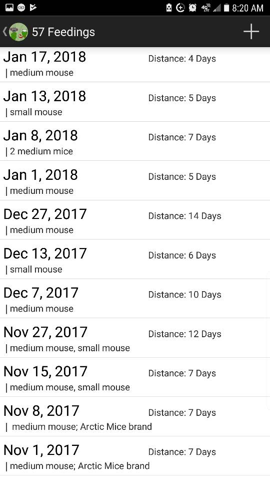 the large mice i was offering where ~25g on their BEST day, meaning they were almost always smaller than that (probs closer to 20g). i offered 1 large mouse (~25g) every 7 days from feb to the end of march.