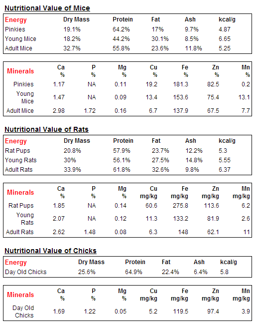 Part of the problem with charts like this is that it still would be best to have expert interpretation of the data with respect to keeping snakes: It's still only a comparison of domestic rodents+, not the natural diet of snakes, and what's more, I think many of us might assume that a slightly higher % of protein in adult rats makes them "better than" mice for snakes, BUT we still don't know if that higher % is what's actually best for the snakes- many times, nutrition is about a certain optimal balance of nutrients- ie. how they work together in the body. So I think we should be careful about making assumptions.