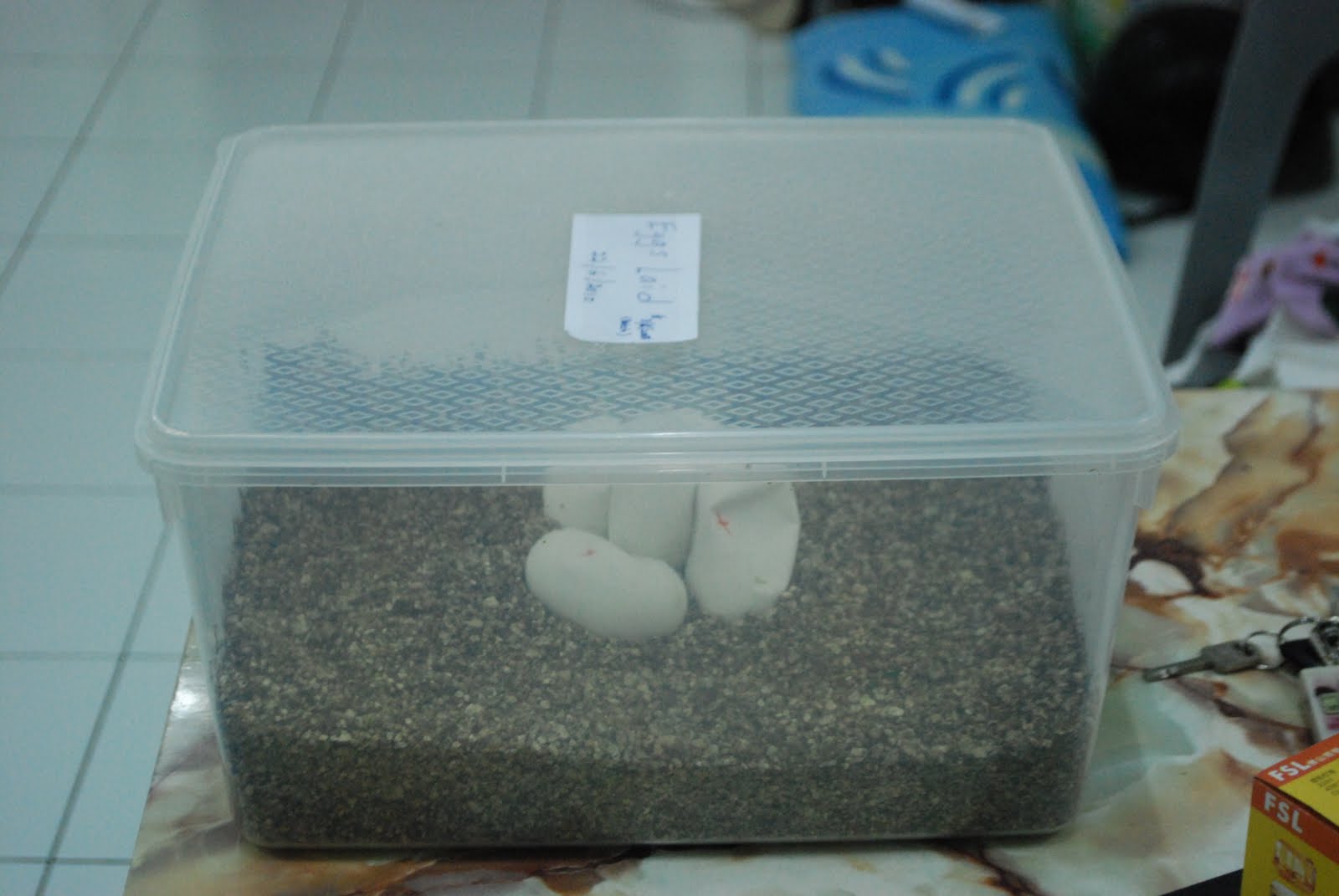 For my last clutch of 5 eggs, I uses 1.5Kg of vermiculite and 1.5kg of water mixing it together. Here is some photos.