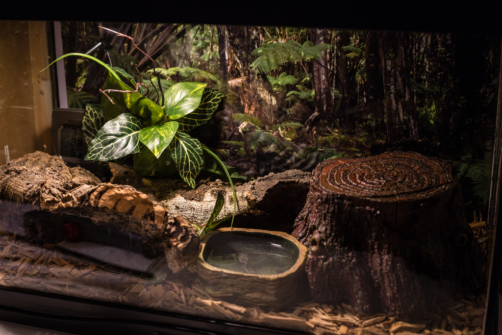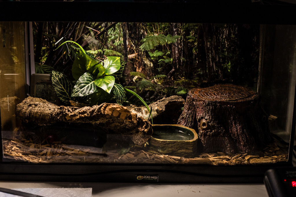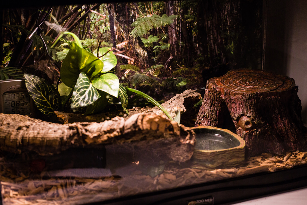 Ambient temps in the room are 72-75f, I'm providing supplemental heat with an UTH set to 92f positioned on the right hand side, the thermostat probe is sandwiched between the heating element and the glass, along with a 120watt CHE above on a dimmer with the thermostat probe running to the cold side set to 80f. I'm maintaining humidity with foil covering 3/4 of the top screen and daily misting sprays of water. Using Cypress for substrate, several pieces of cork bark and the plastic stump hide along with some silk & plastic plants. The background is just an image I grabbed off Google Images and printed on my inkjet printer.