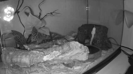 After his feeding the other night, Leo's been spending a lot of time in his sauna/warm hide. I've setup a camera with IR LEDs for night vision so we can get alerts when he is out and about and see what he's up to in the middle of the night. Seems like right around 3:00am is when he likes to venture out and do a bit of exploring.