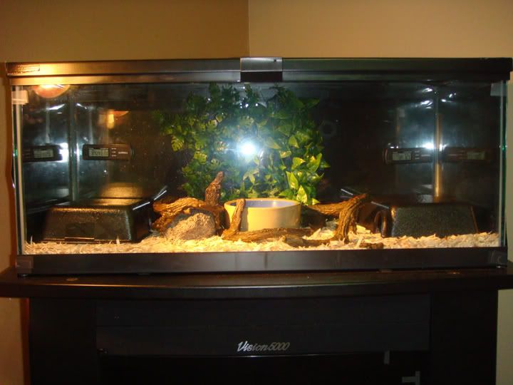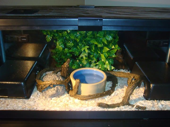 Here's a view from the top. I covered 3/4 of it with tinfoil topped with rubber vinyl (to line a truck bed with) to make it nice black color. This keeps humidity up. I have 2 ceramic lamps - one with SunGlo bulb the other with NightGlo. The snake outgrew the tiki hut, so I replaced it with a decor from my aquarium that looked perfect as a hide. Snake likes it. There's also a UTH underneath. And I swapped the Aspen with Desert Snow to keep humidity up as well. It's twiced-milled Cypress now though. I just didn't like the white - it didn't look natural. Cypress also keeps humidity up.