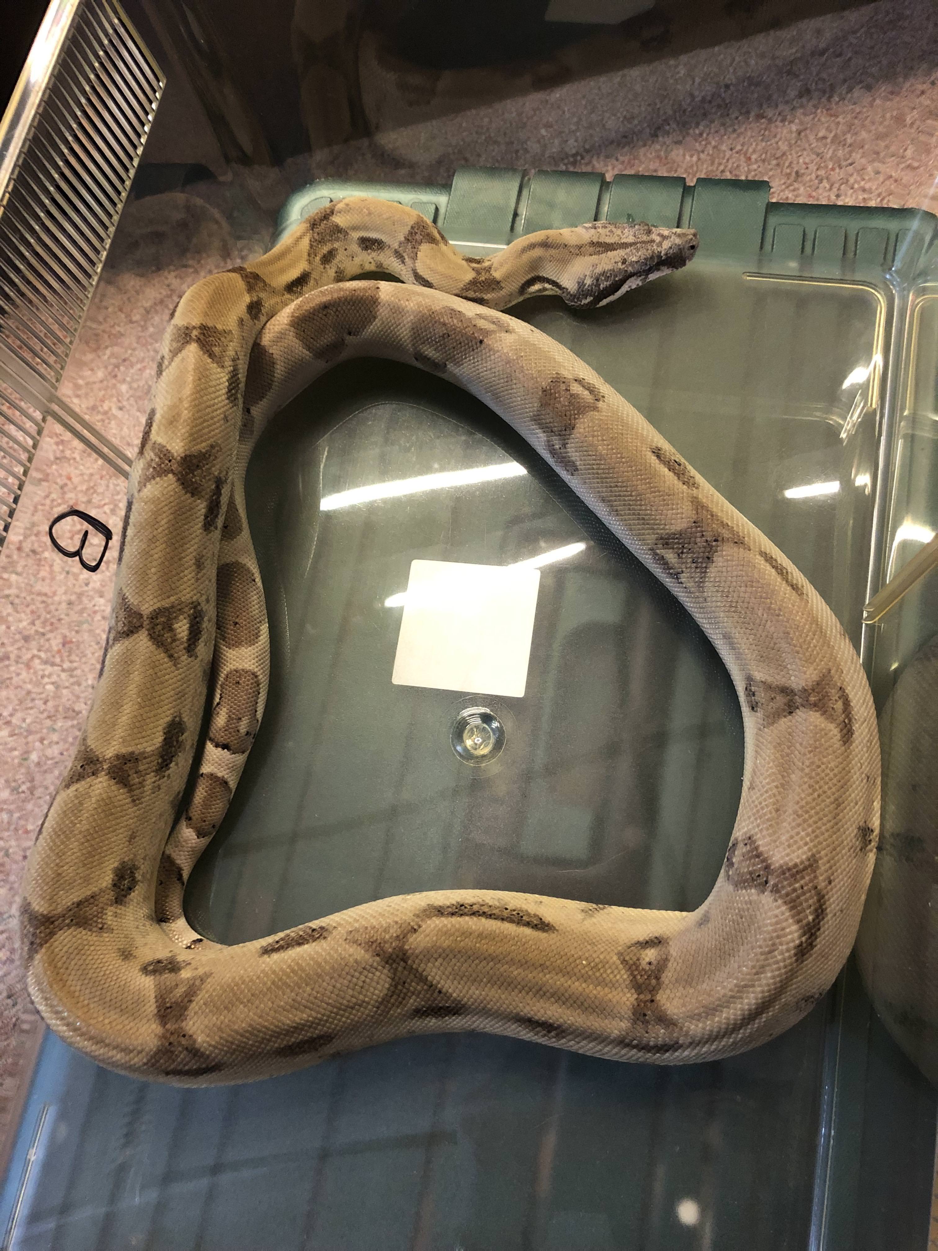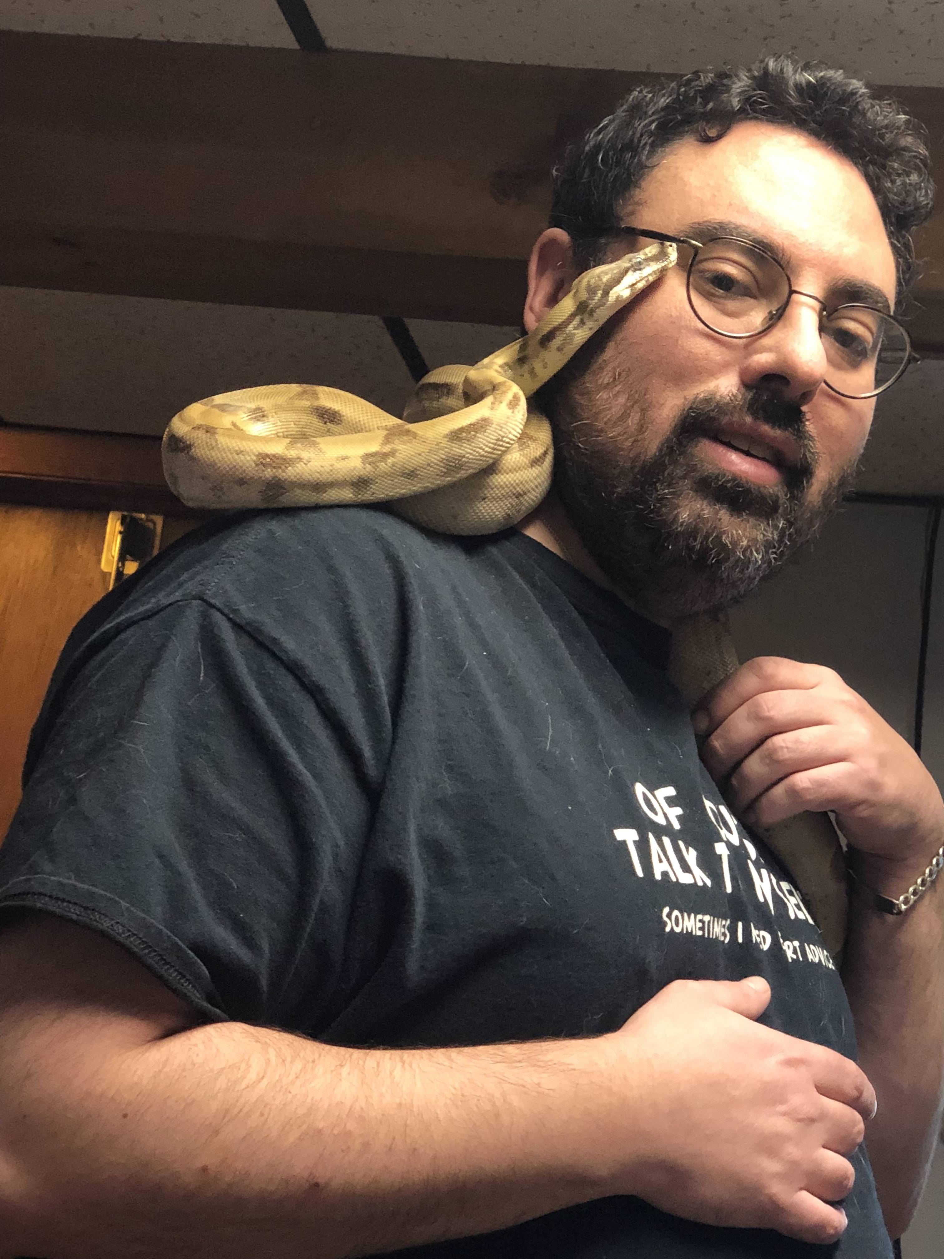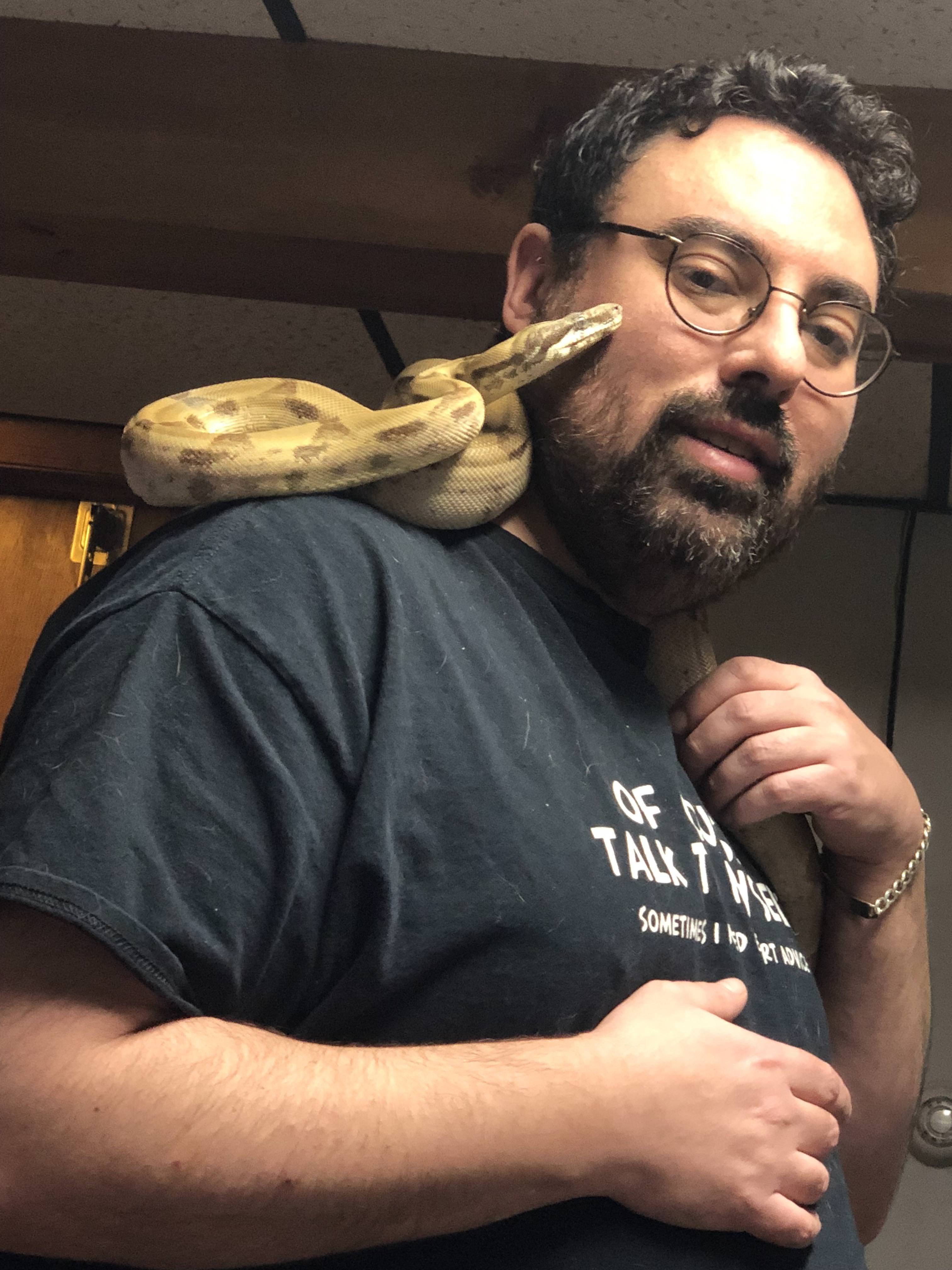 Behira is awesome. She's due to eat this Sunday, but because of work/travel schedule, she'll have to wait until Tuesday. In the meantime, she's still chill and docile as can be and loves climbing on and around her Dad.