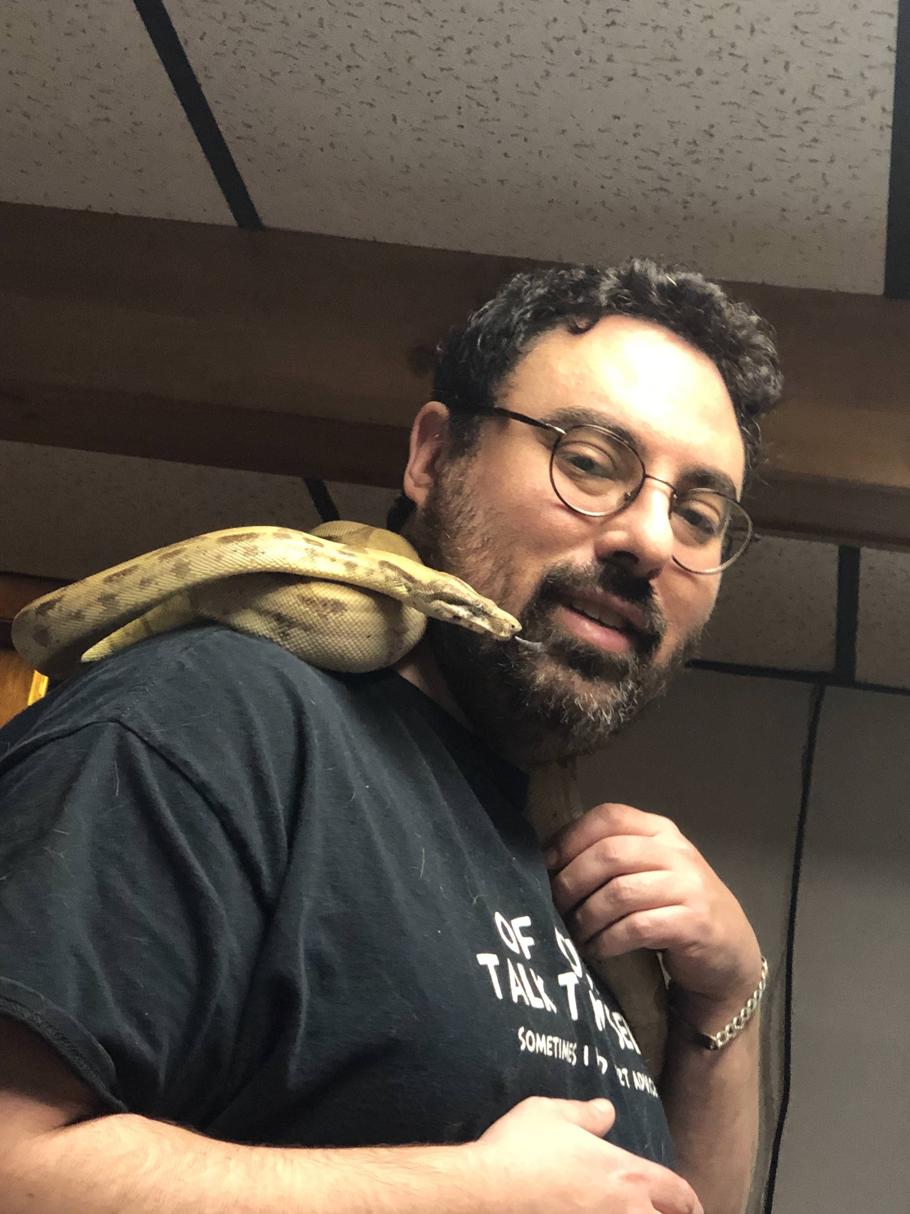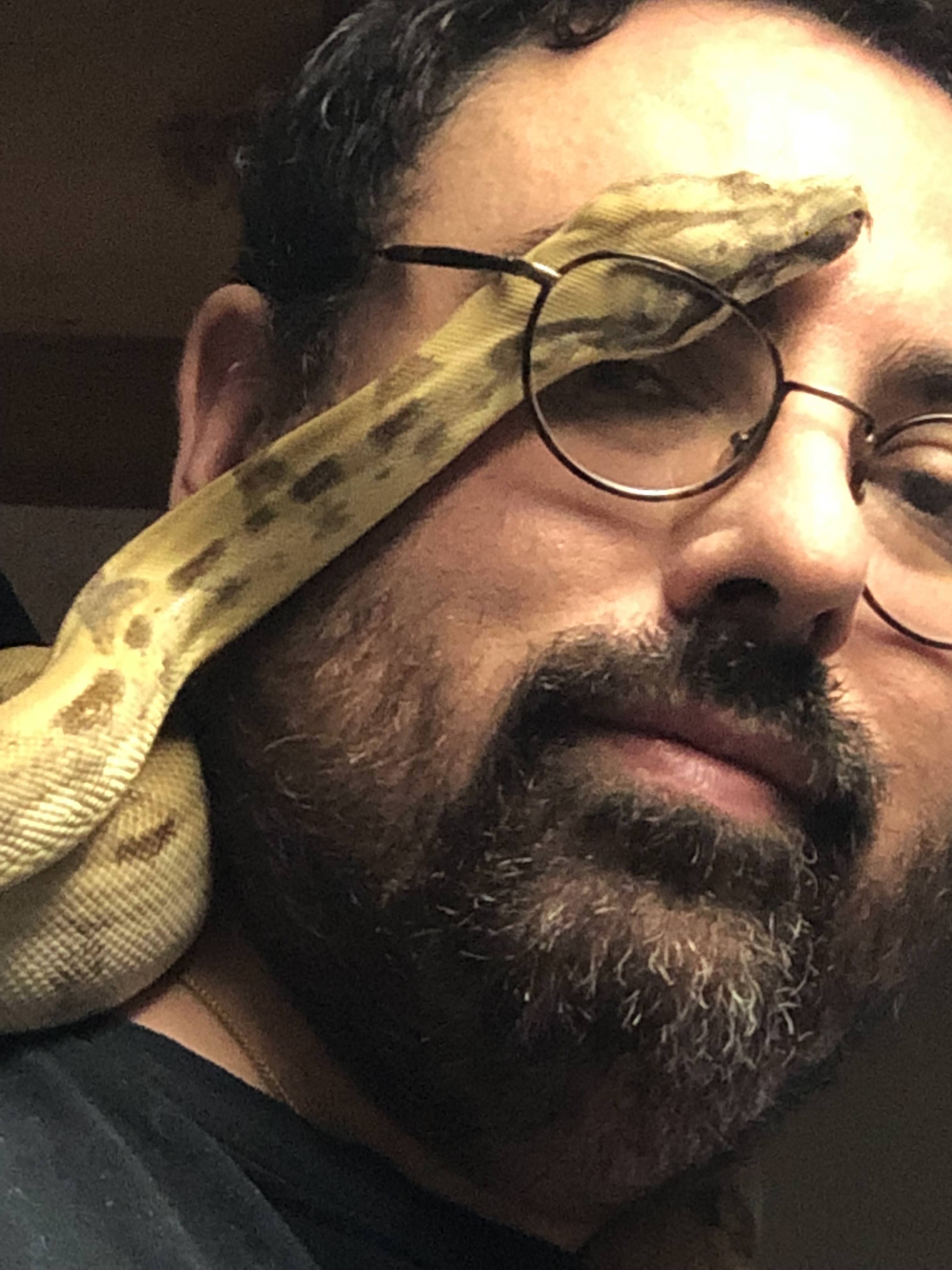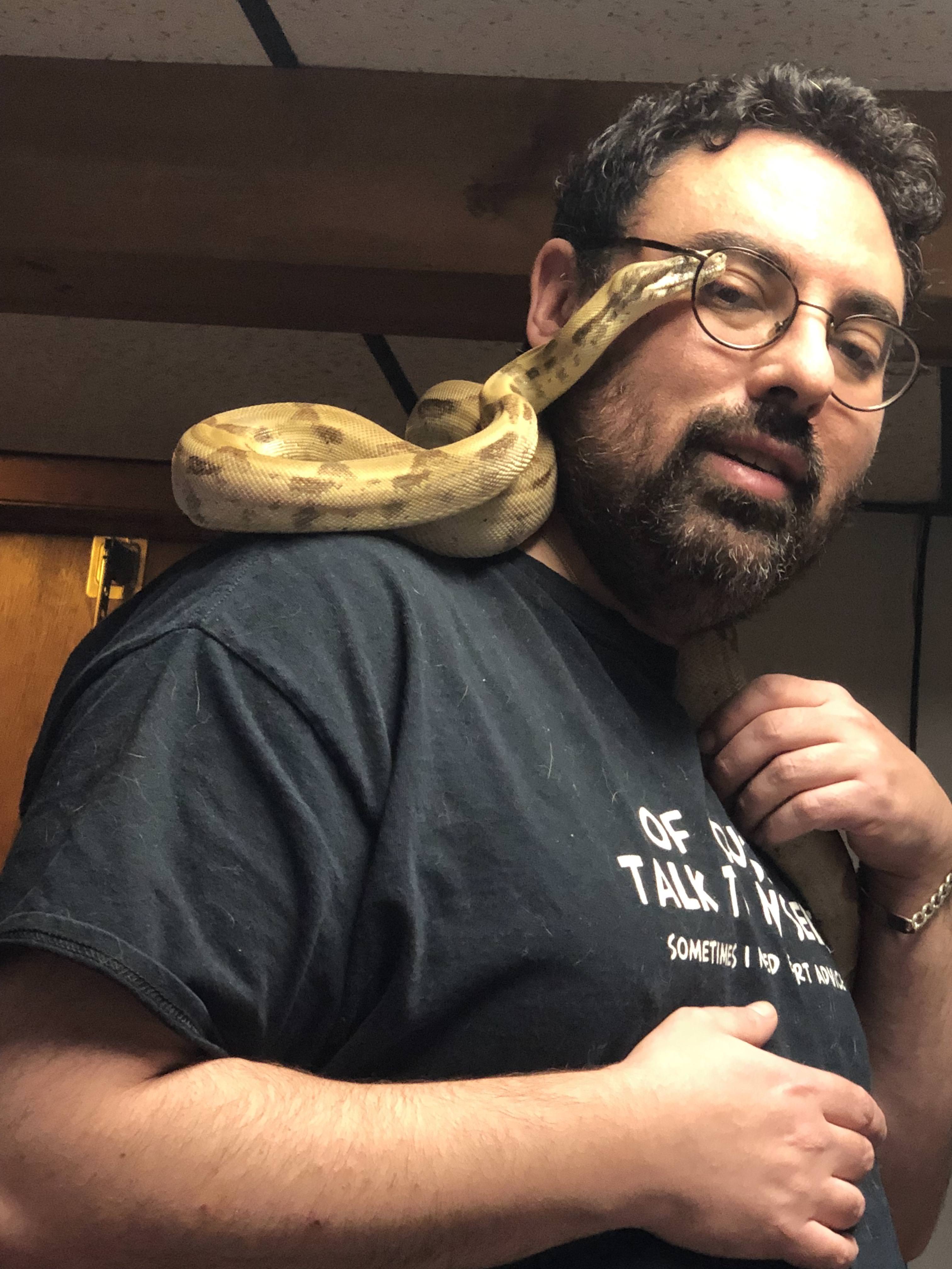 I got a couple pictures below and a link to a video of her climbing on my shoulders and being calm as can be. There's a reason I just got another Boa (Feliz); that reason is Behira - awesome animal!