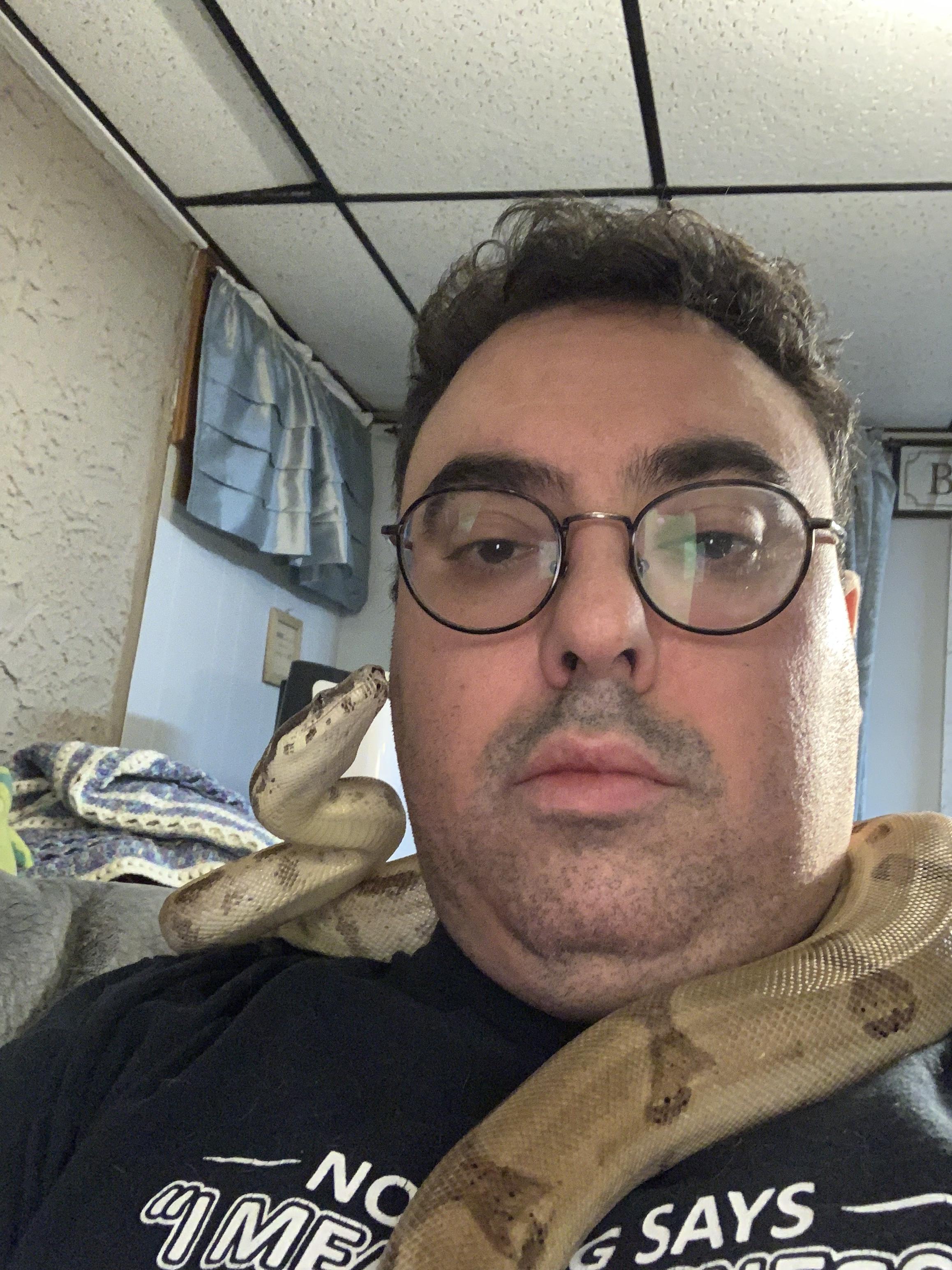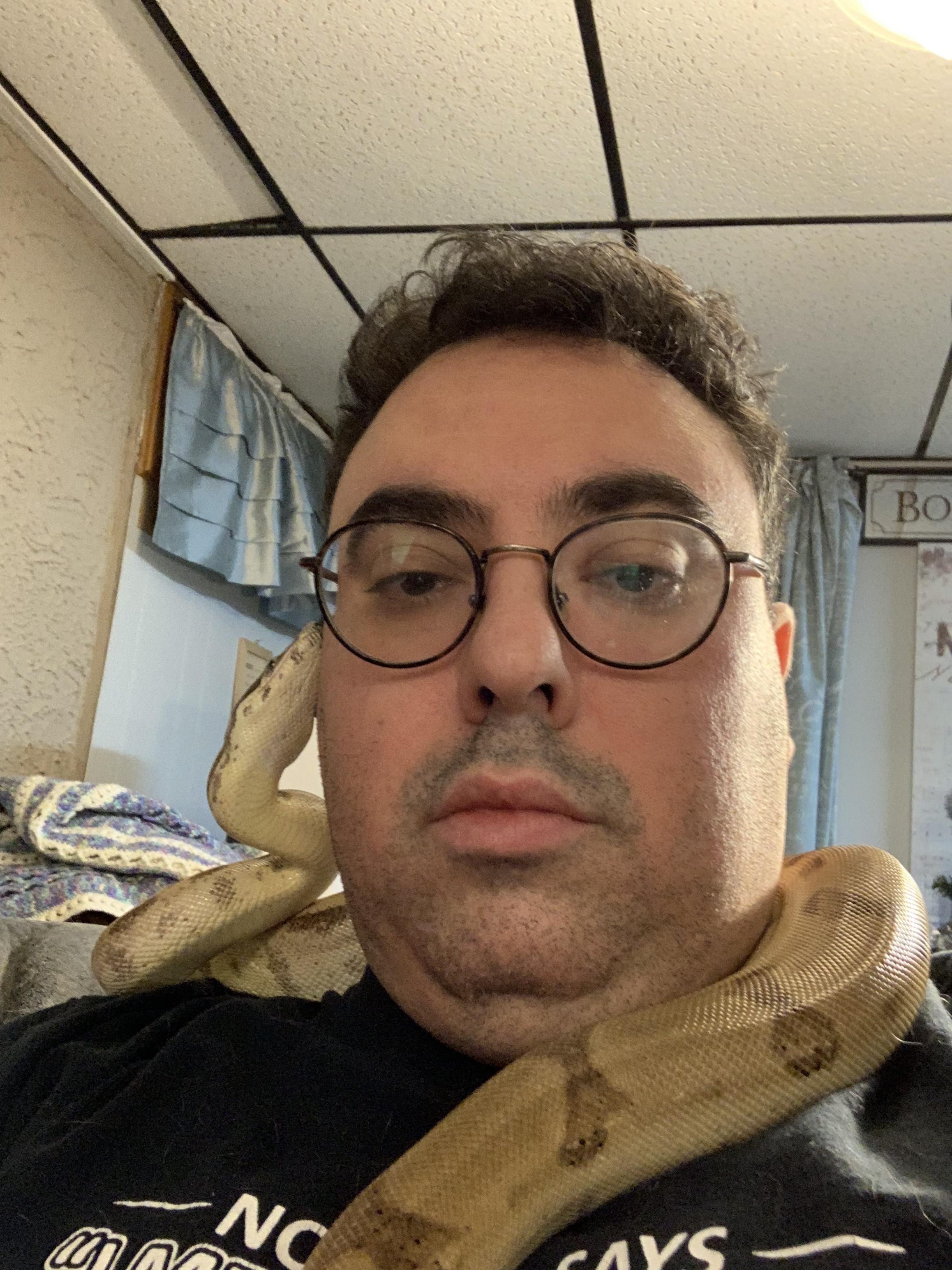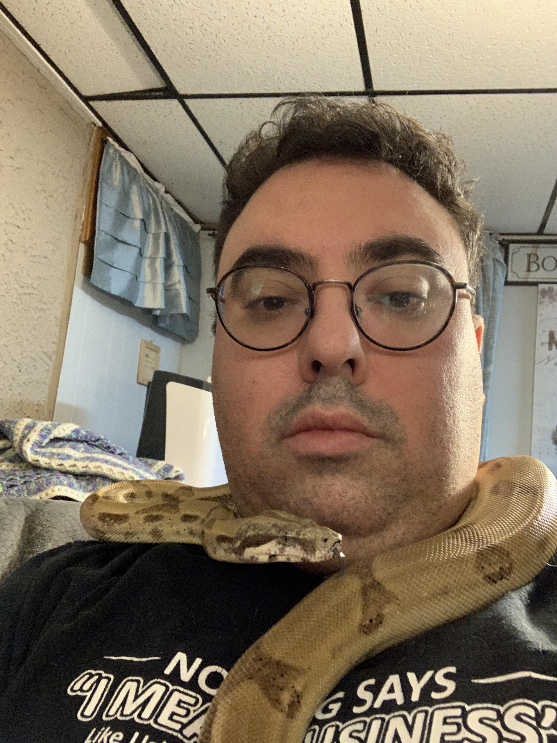 Note: For those concerned, or who have constrictors, and may not know; Do not let a constrictor around your neck completely. Do not let them coil around. My rule is that Behira can hang on my shoulders, or lean from one side to the other with her head. However, as soon as her head touches her body in a loop, anywhere close to my neck, she gets redirected. What you cannot see in the pictures is that I have the camera/iphone in one hand, near Behira's body, her tail/lower body in the other. The moment she attempts to overlap her head and body or tightens at all, I unravel from the tail and redirect.