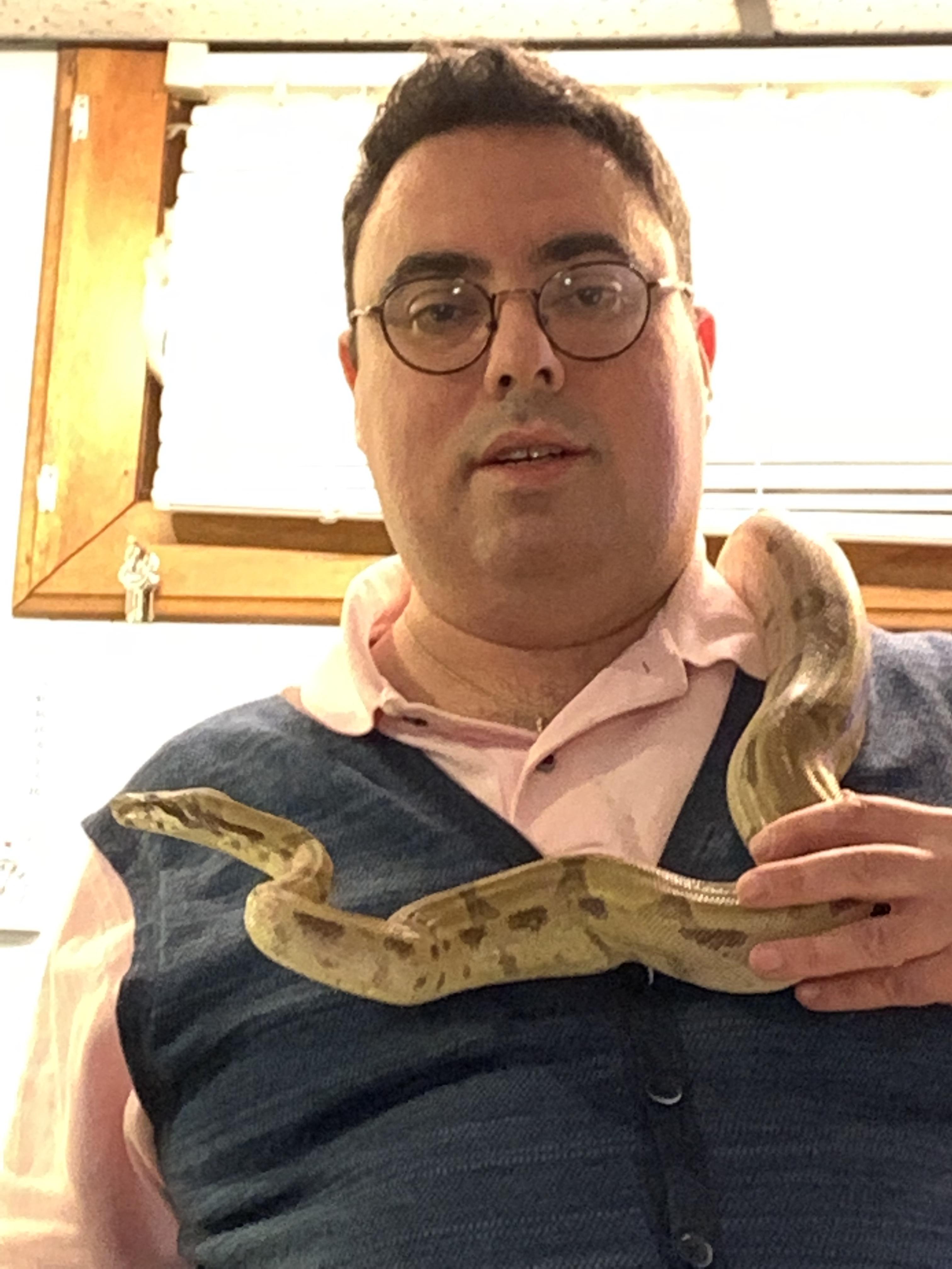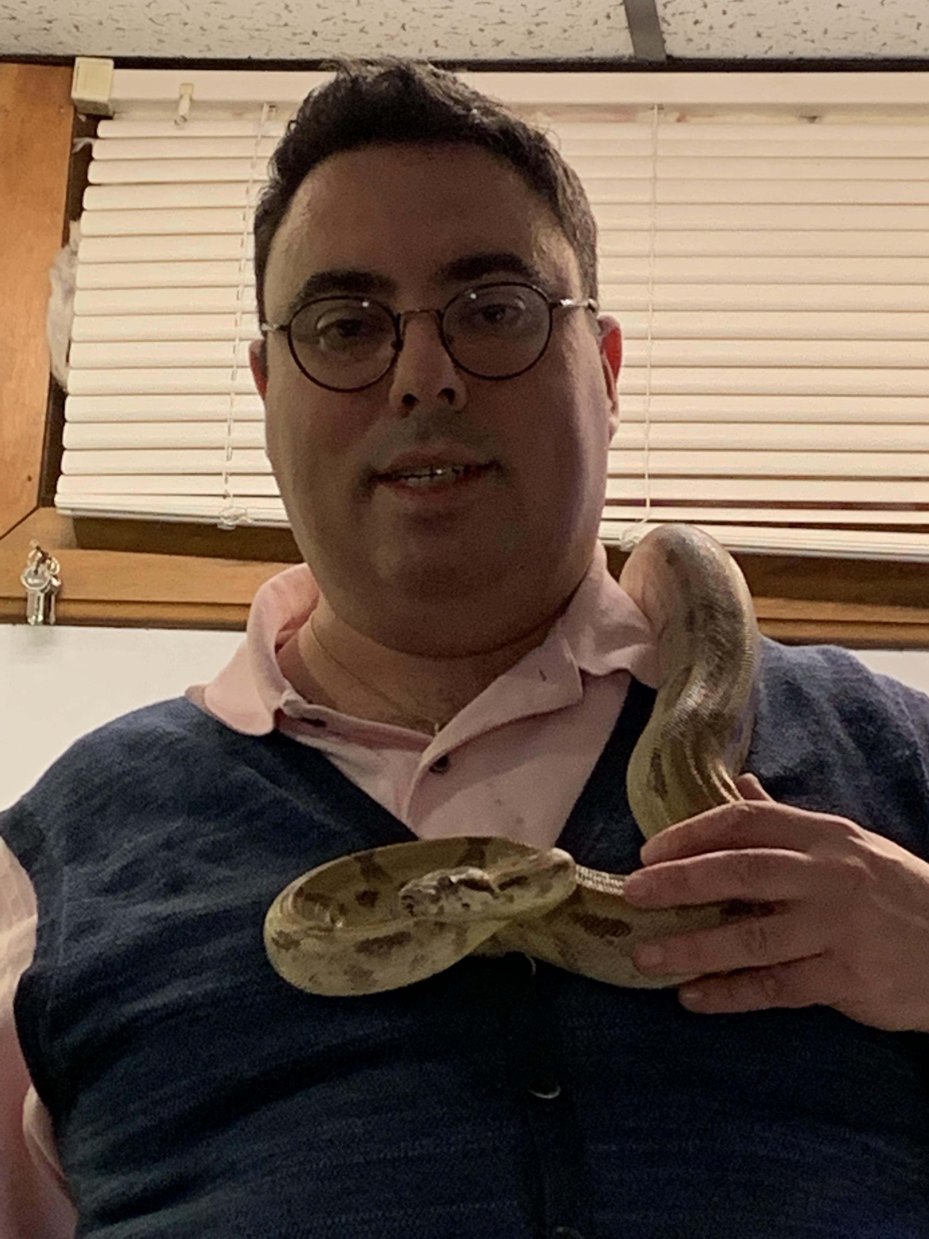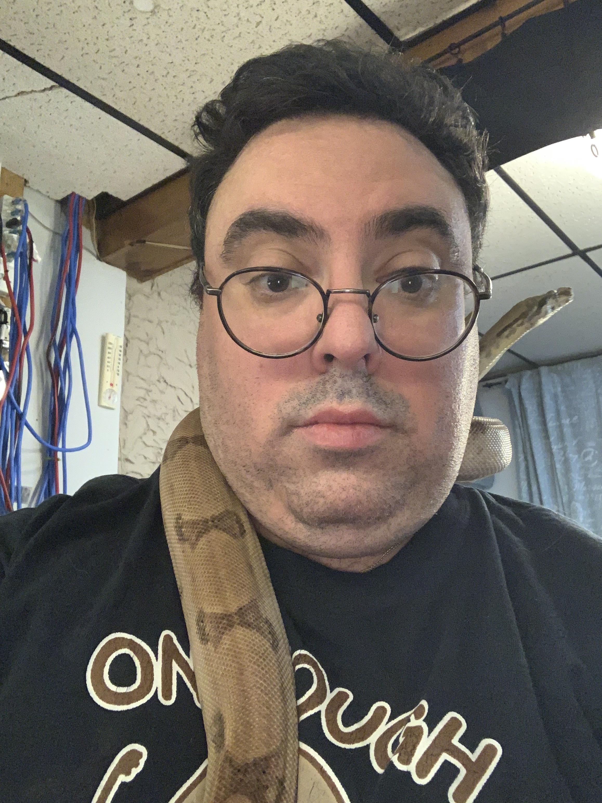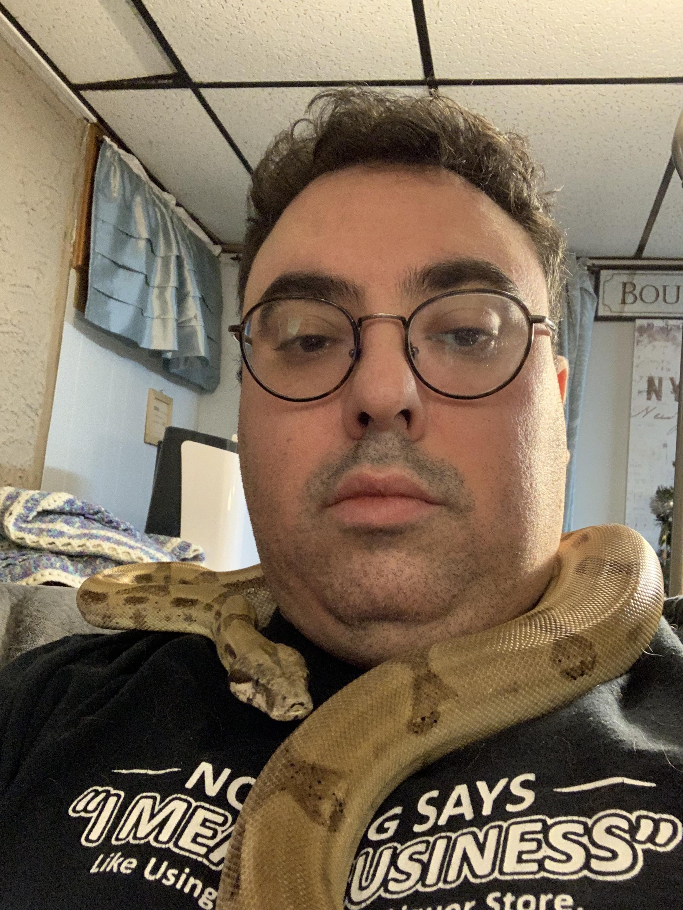 Note: For those concerned, or who have constrictors, and may not know; Do not let a constrictor around your neck completely. Do not let them coil around. My rule is that Behira can hang on my shoulders, or lean from one side to the other with her head. However, as soon as her head touches her body in a loop, anywhere close to my neck, she gets redirected. What you cannot see in the pictures is that I have the camera/iphone in one hand, near Behira's body, her tail/lower body in the other. The moment she attempts to overlap her head and body or tightens at all, I unravel from the tail and redirect.