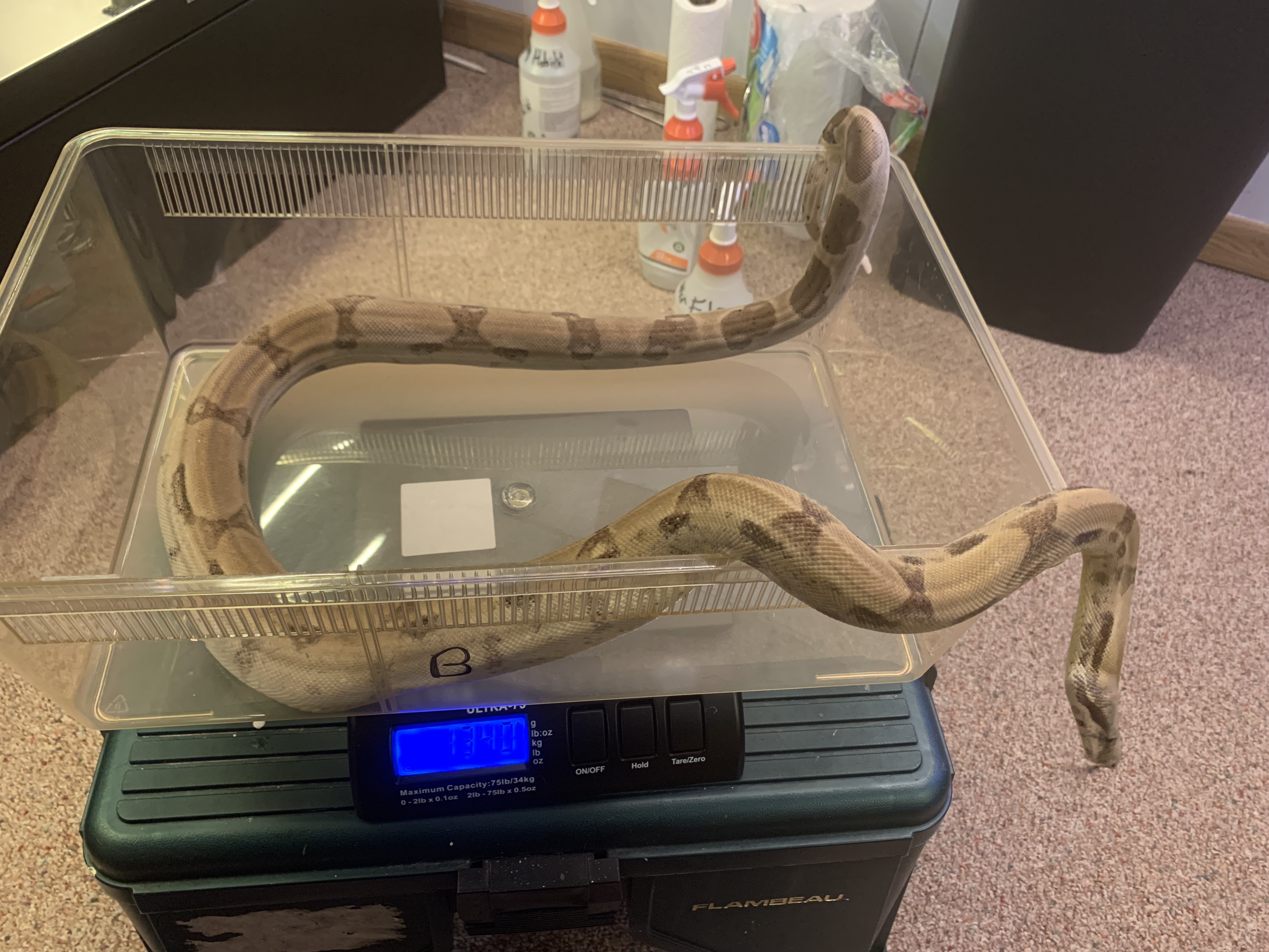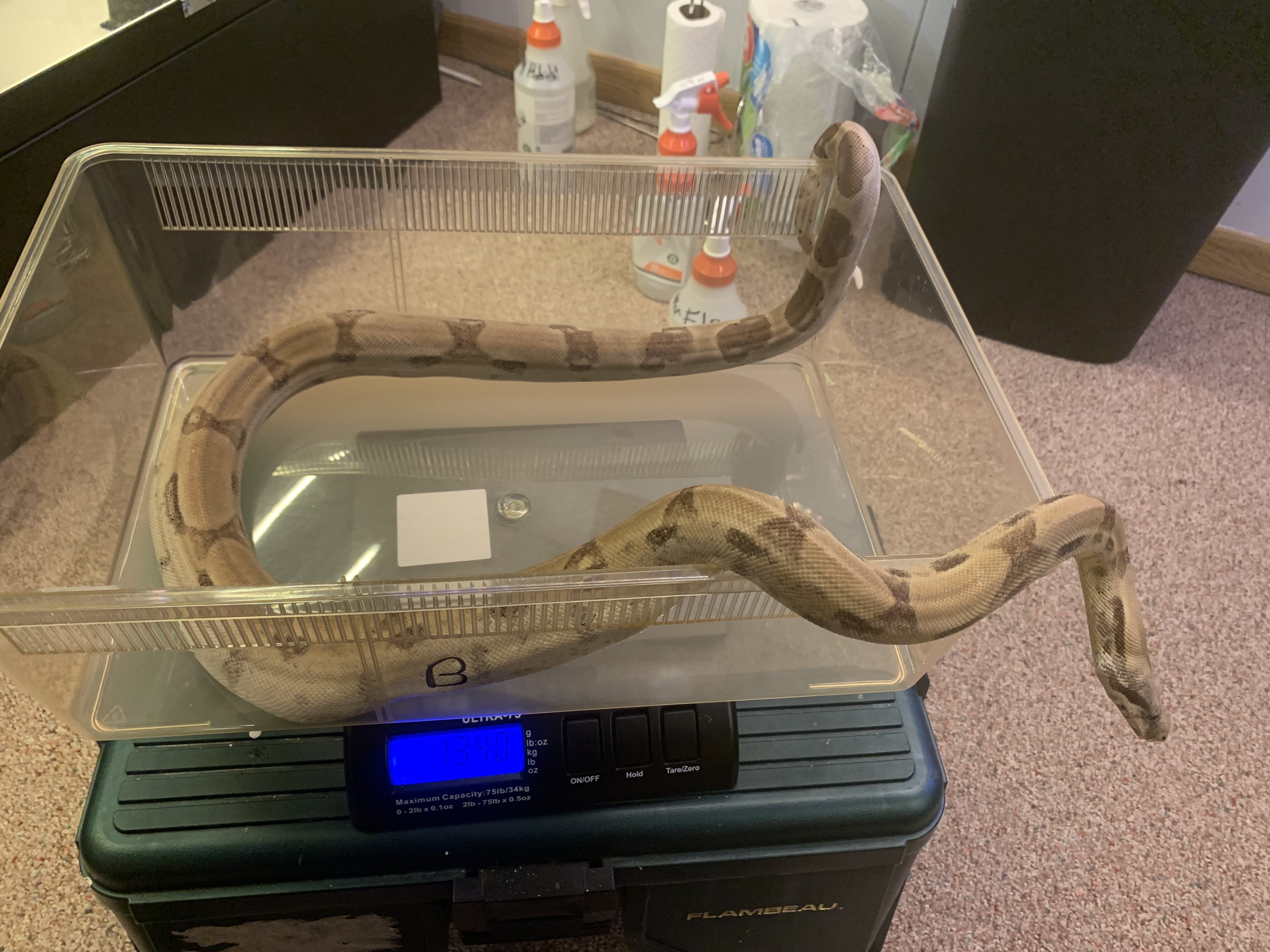 Behira left me a nice present this morning. She got weighed and has hit a growth spurt. She weighed in today, dry, at 1,340G.