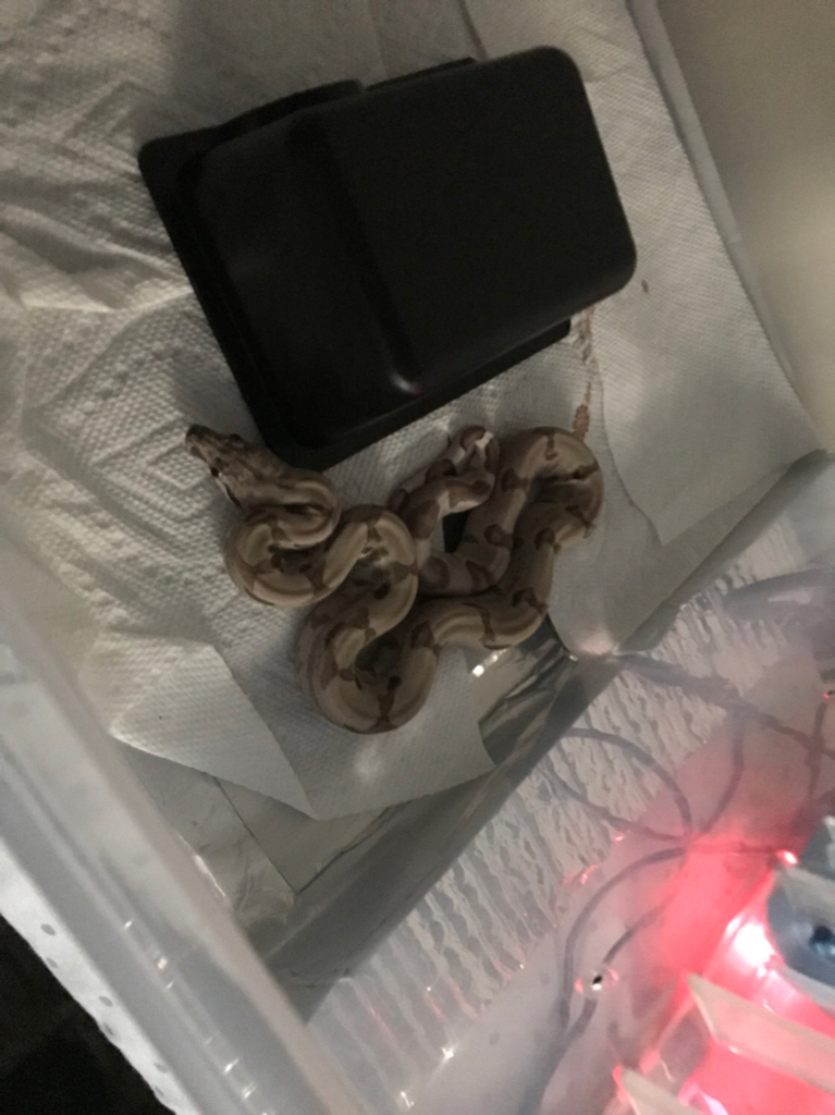 With two successful feedings followed by 48 hours of waiting, I finally was able to start some short handling sessions with Phantom. Up until two nights ago, I never witnessed him using either of the hides. I decided to bump the temps down just a little and all of a sudden I found him in the hide nonstop. So either it was a temp issue or he finally realized what a hide was. I was almost a little worried what I might find when I lifted it a couple hours ago since I haven’t seen him in two days.