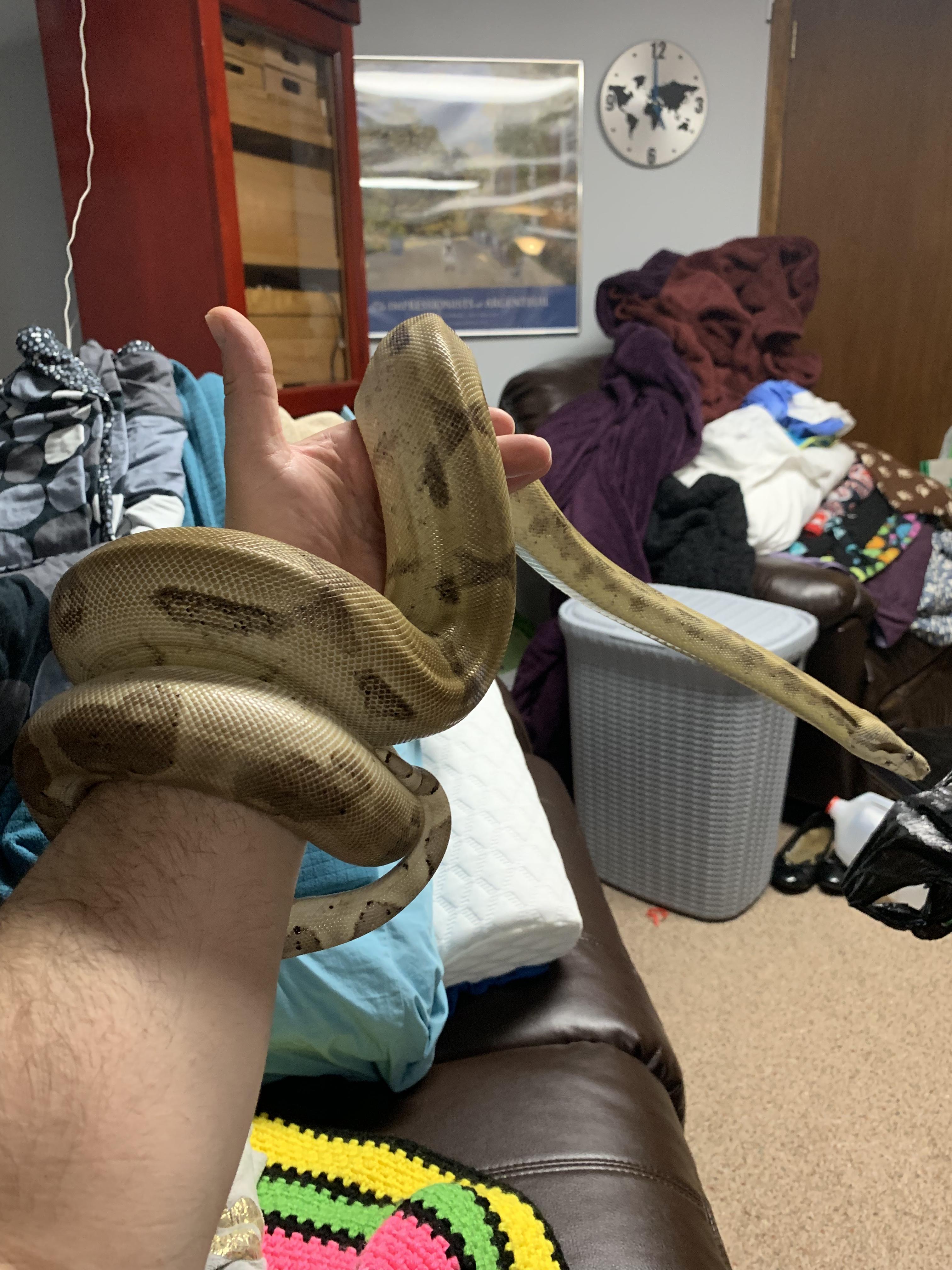 When I see pictures of her, more than when I hold her, I am noticing how much thicker she's getting, especially her tail and head. Neither look like baby boa anymore. Her tail is really thickening out. Her head is getting that boa rigid look to it, not the baby face she used to have.