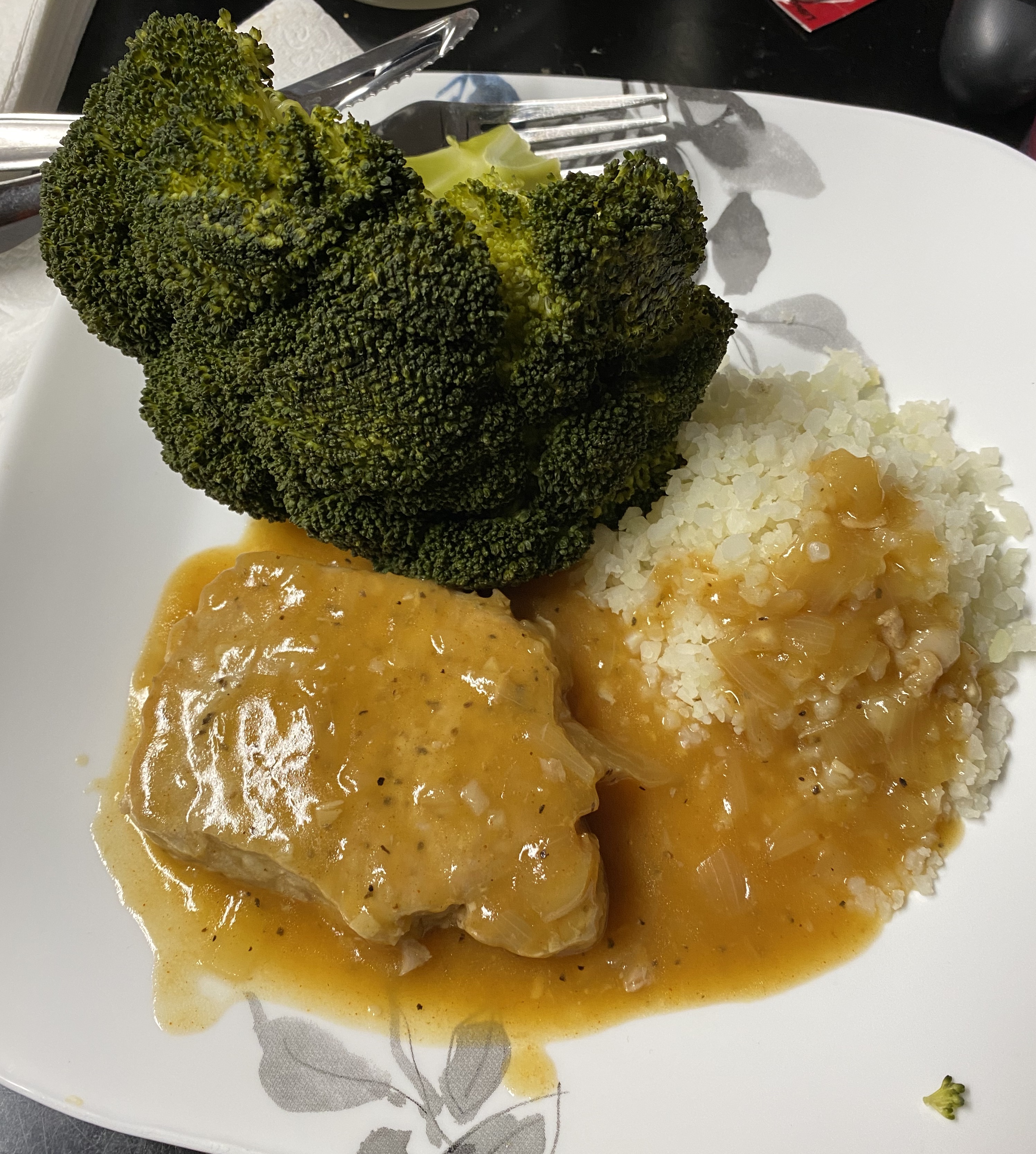 The other night I made Honey Dijon Pork Chops in the instant pot along with some broccoli and cauliflower rice. We cheated with the cauliflower rice and got a steam bag.