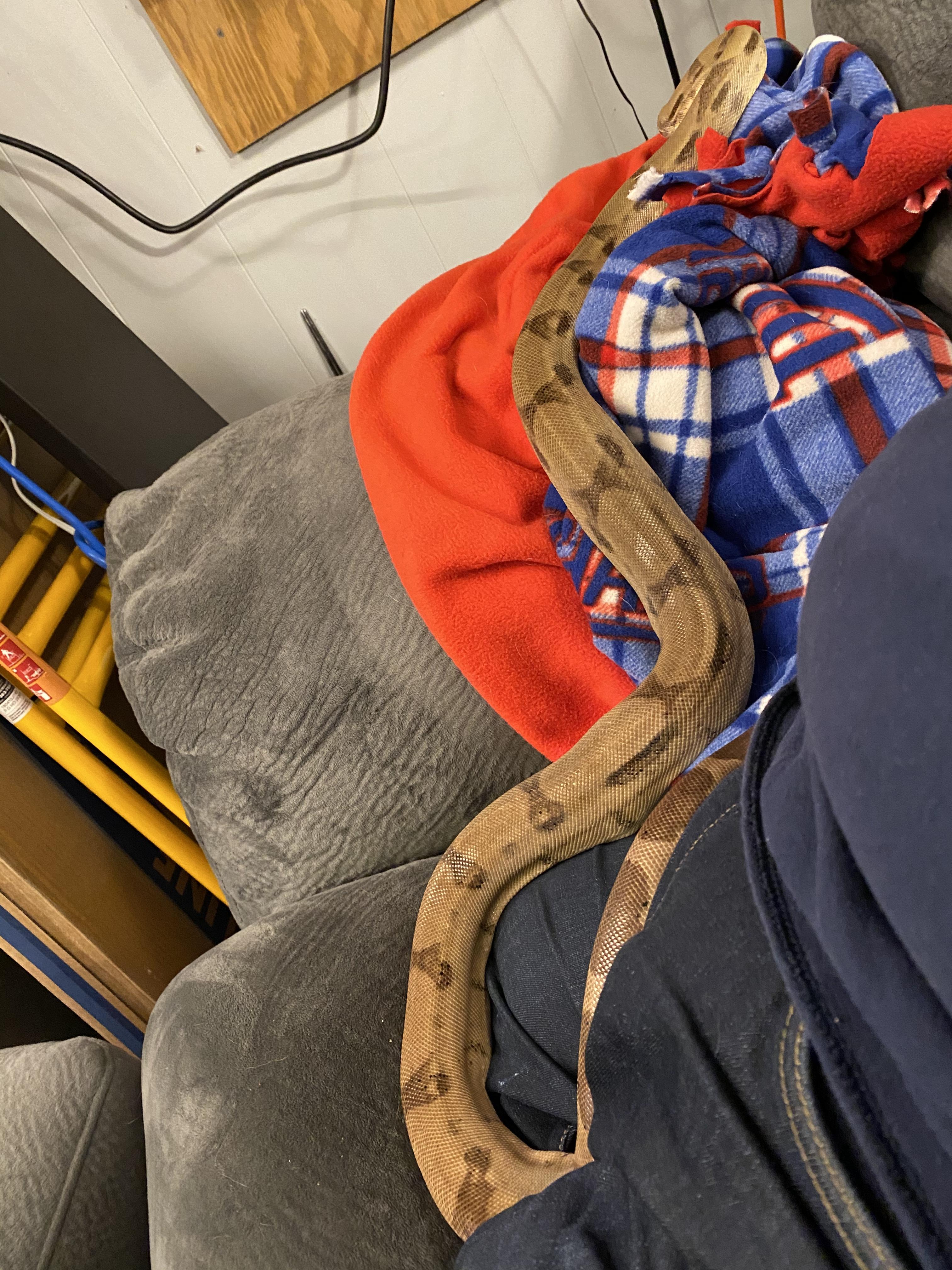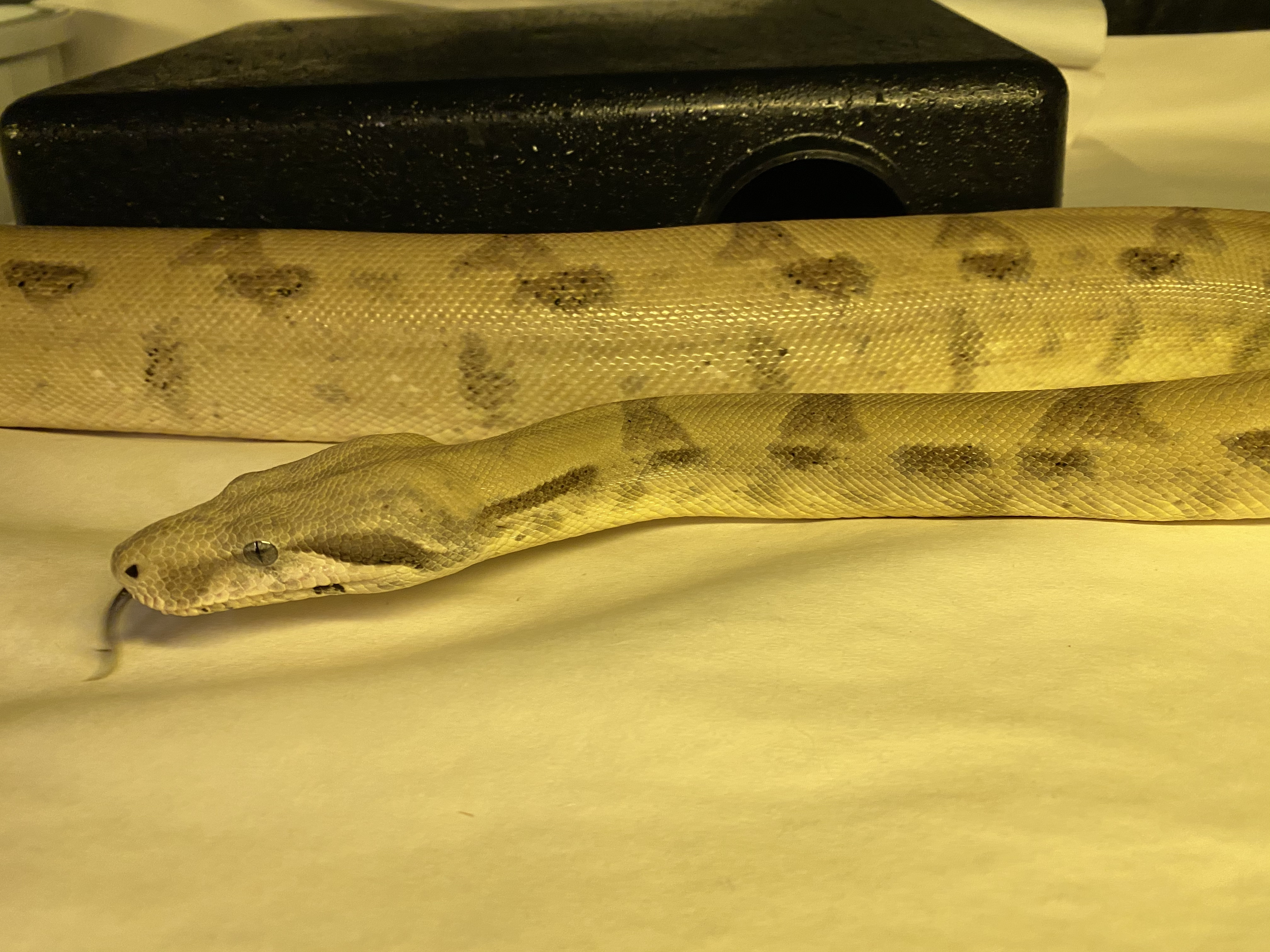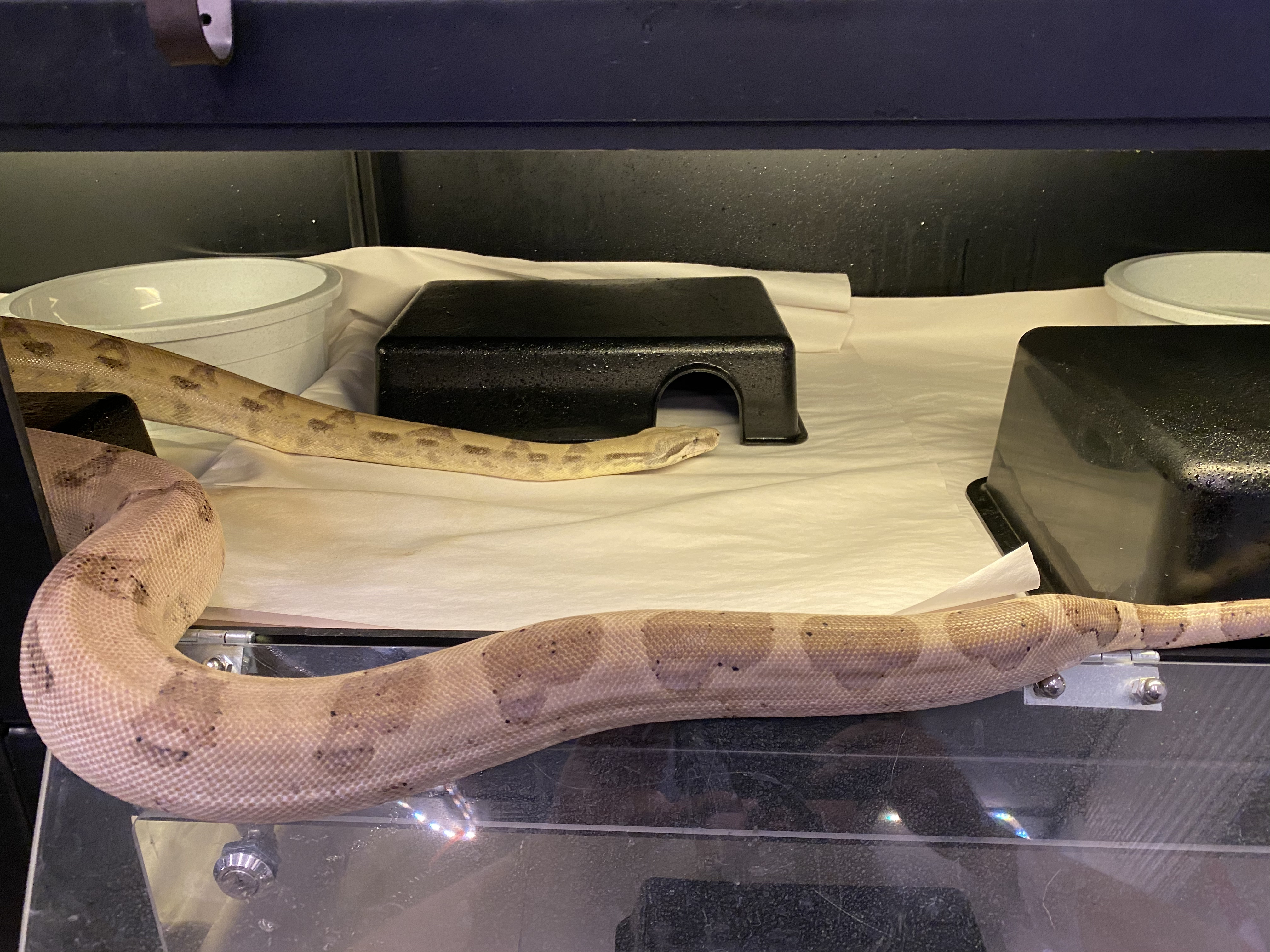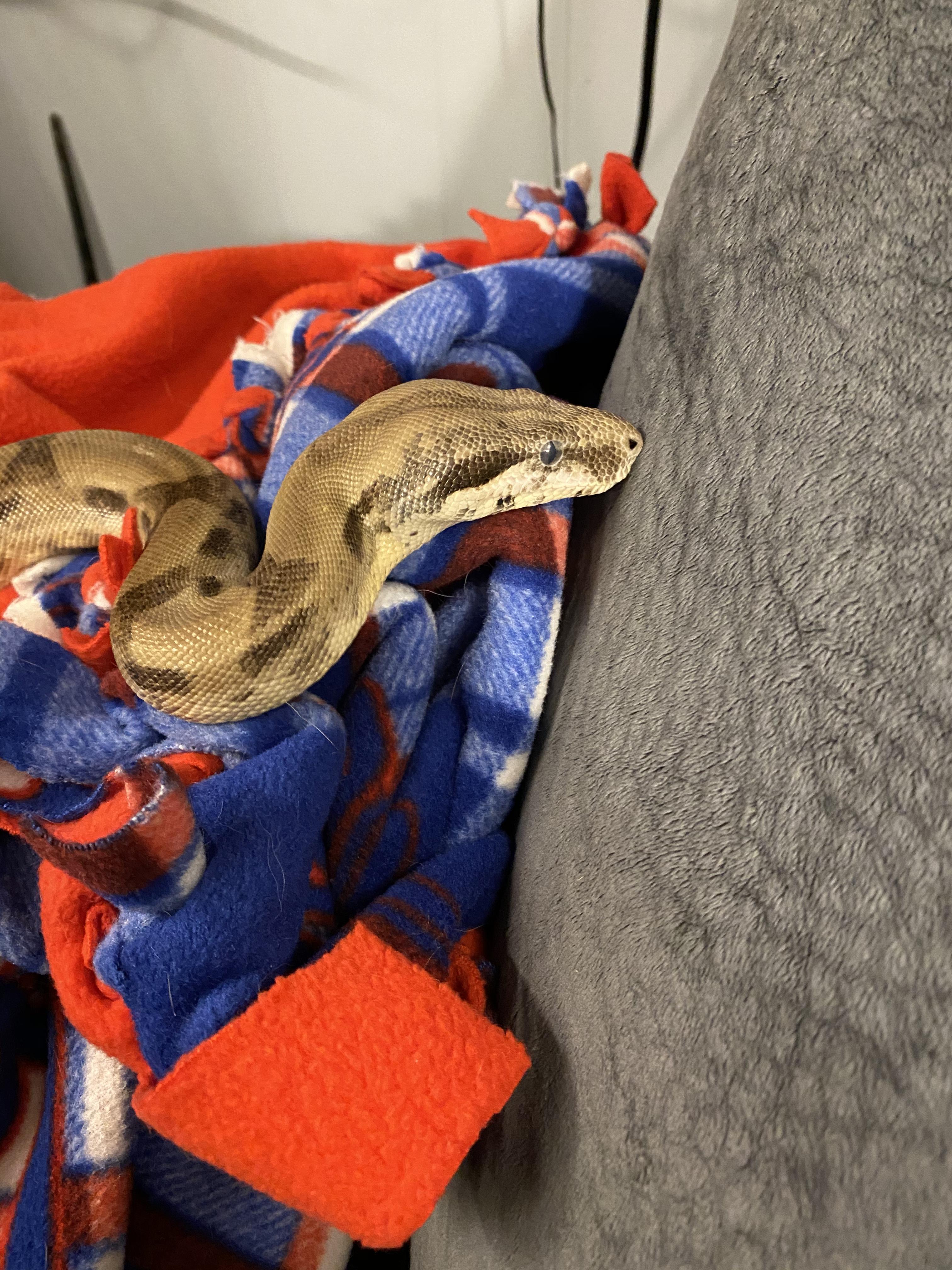 I had Behira out for a bit today. It's been 13 days since she shed last, and she is doing well. She's been gobbling down rats every 10 days and is growing like a weed, from what I can see, and from what her last weight said.