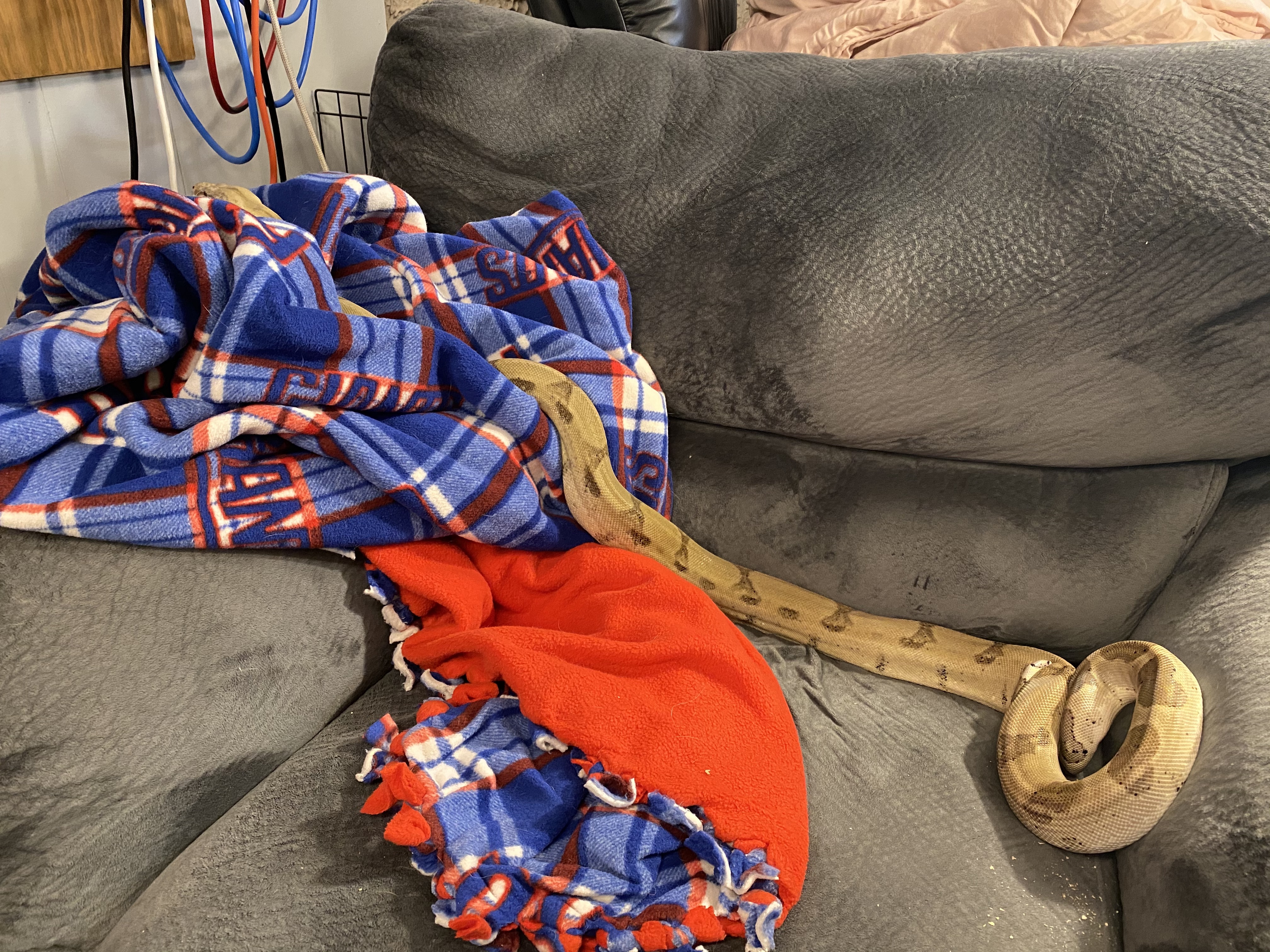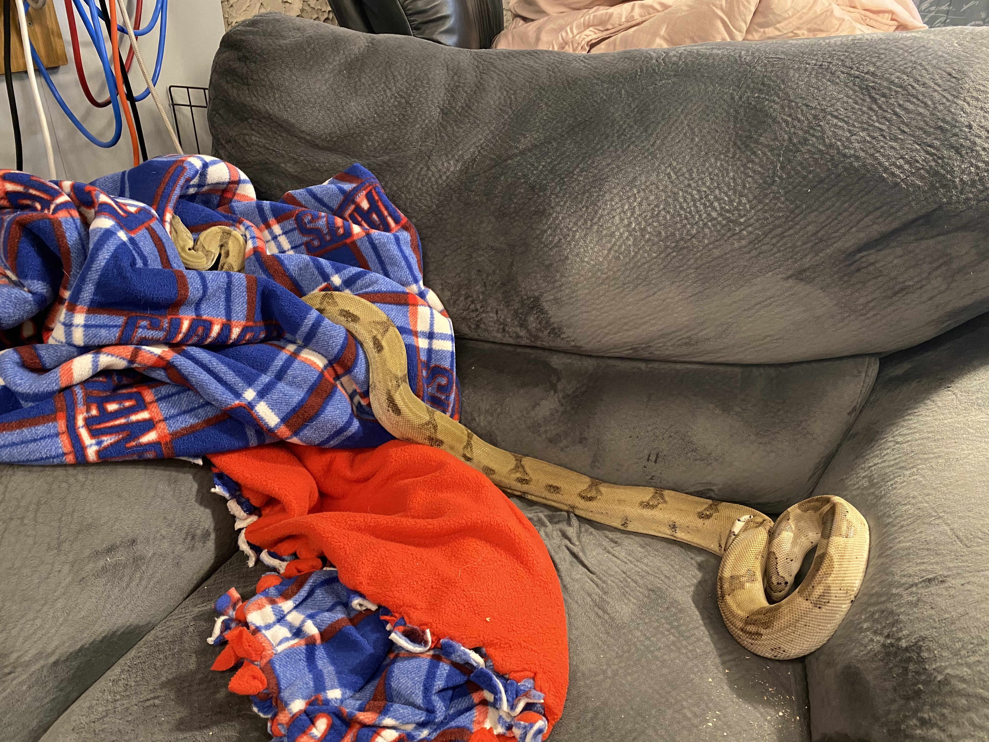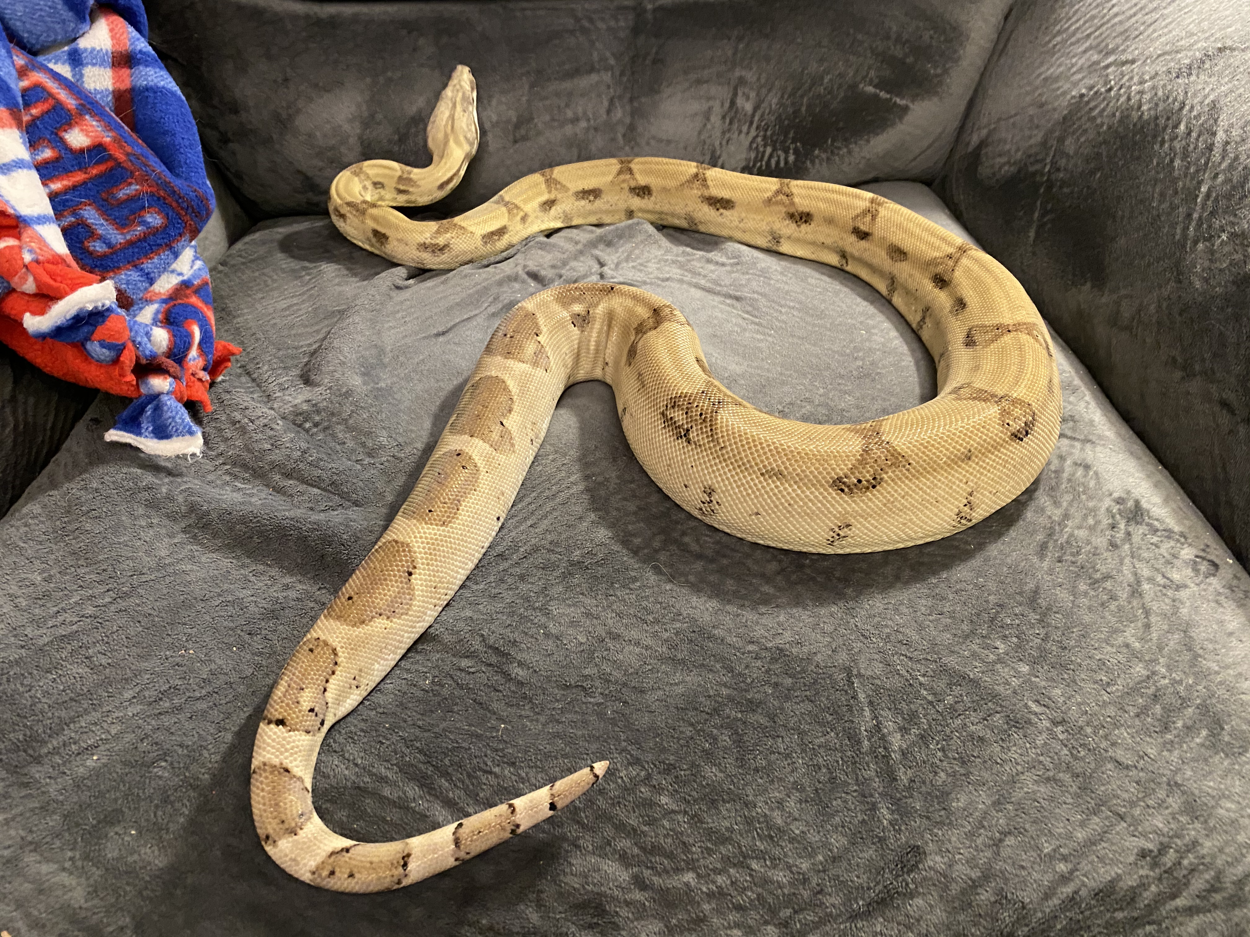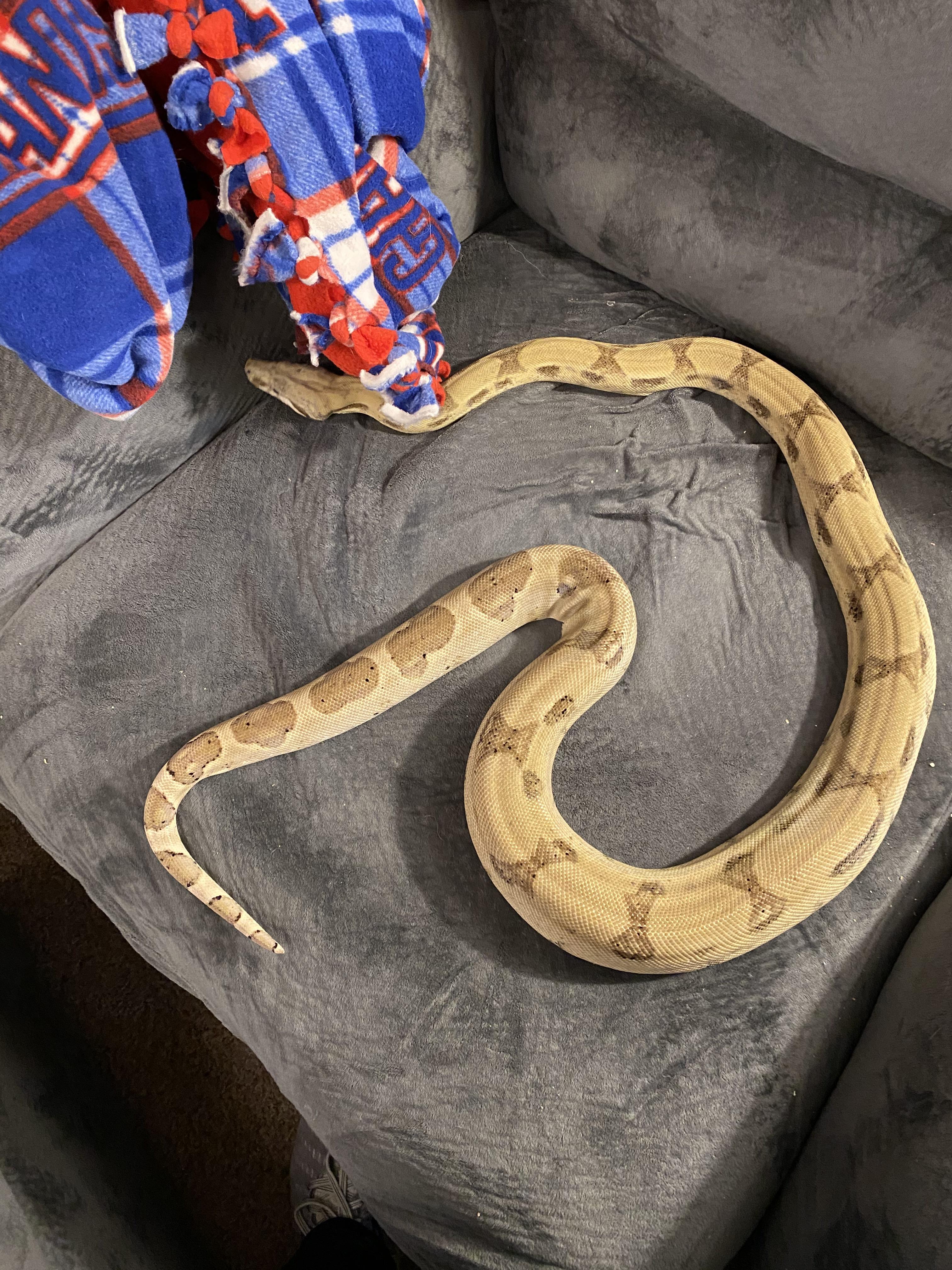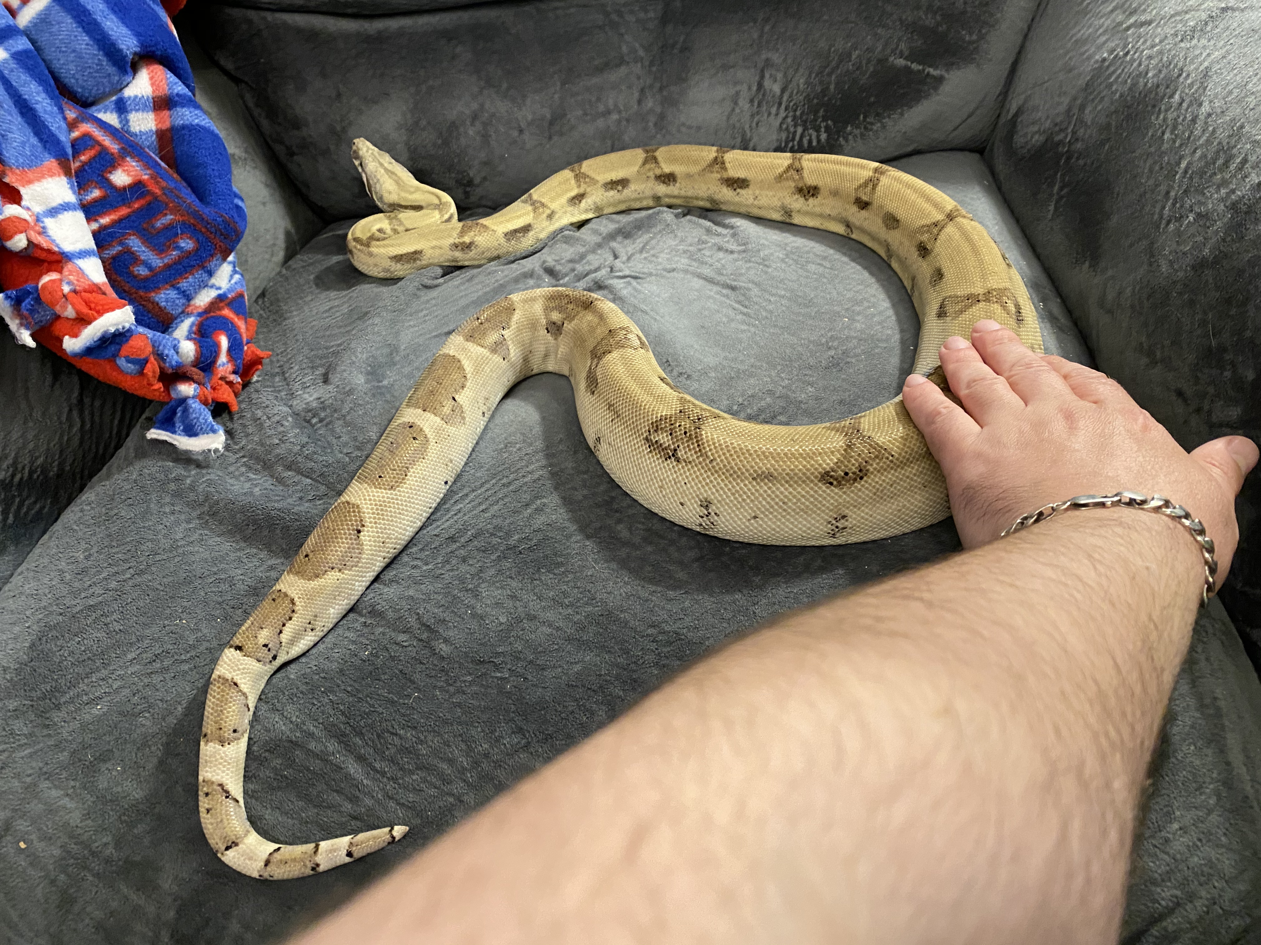 Here are a few pictures of Behira in our huge "reptile area" chair. It's massive but Behira is growing and looking good. I have my hand and arm in one of the pictures to show her size better. "Big" girl is looking good and chill as ever.