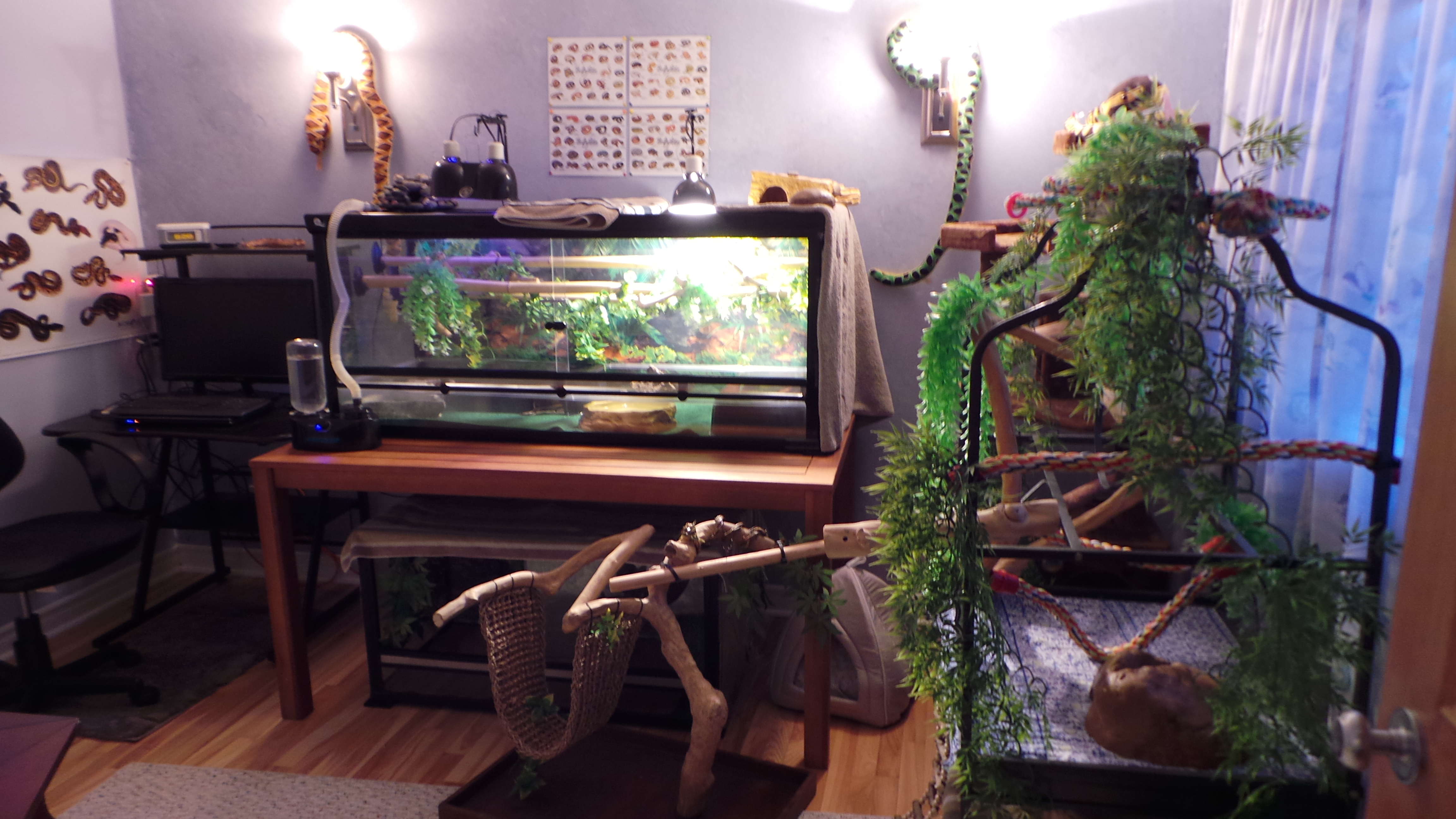 Crowley is doing much better now that his enclosure is in his room, I put him in and he went in his hide and is now getting some rest. I will leave him be for a while as that is a lot of change for my little guy. I'm pretty sure the issue was just the bird. Here's a picture of the new setup.