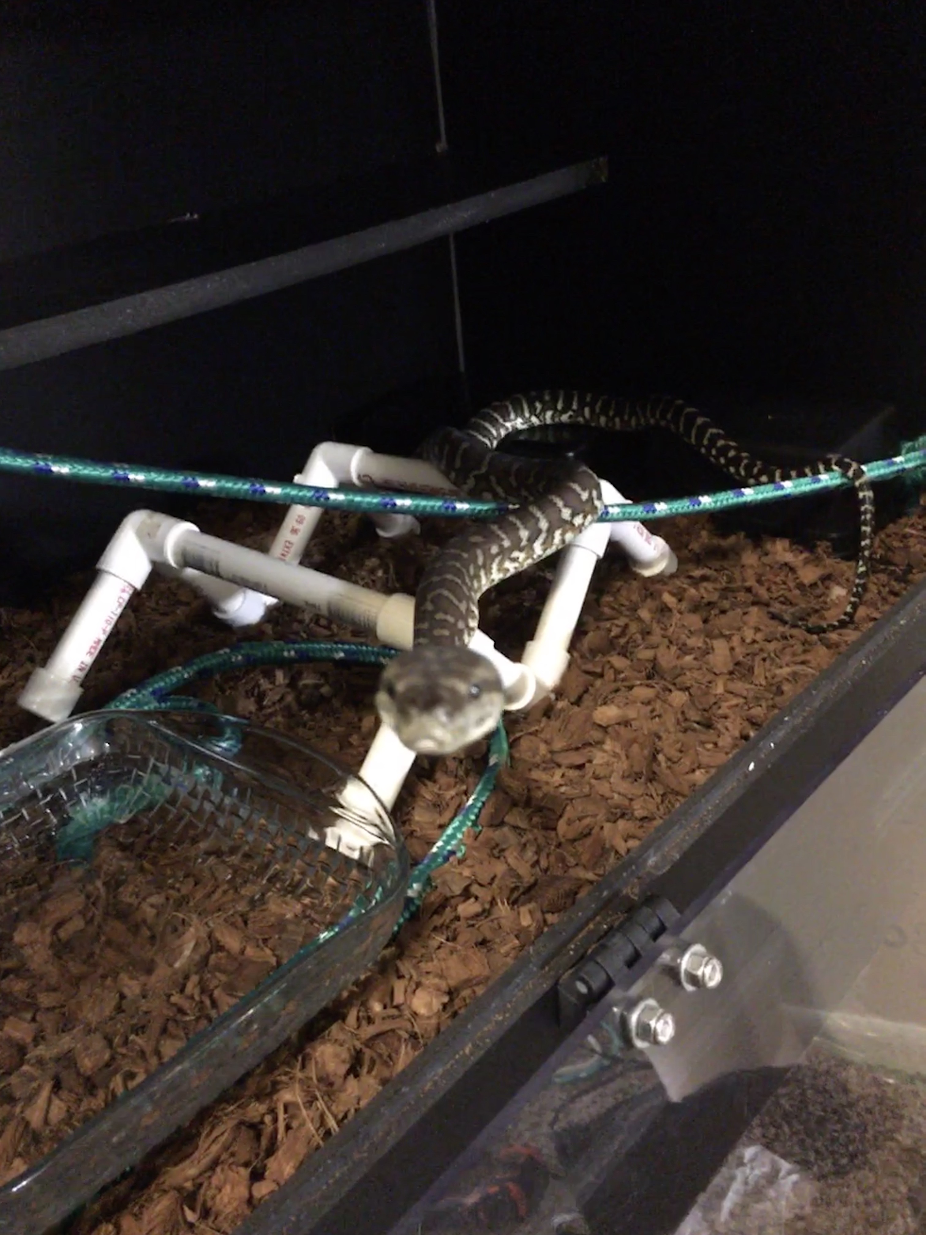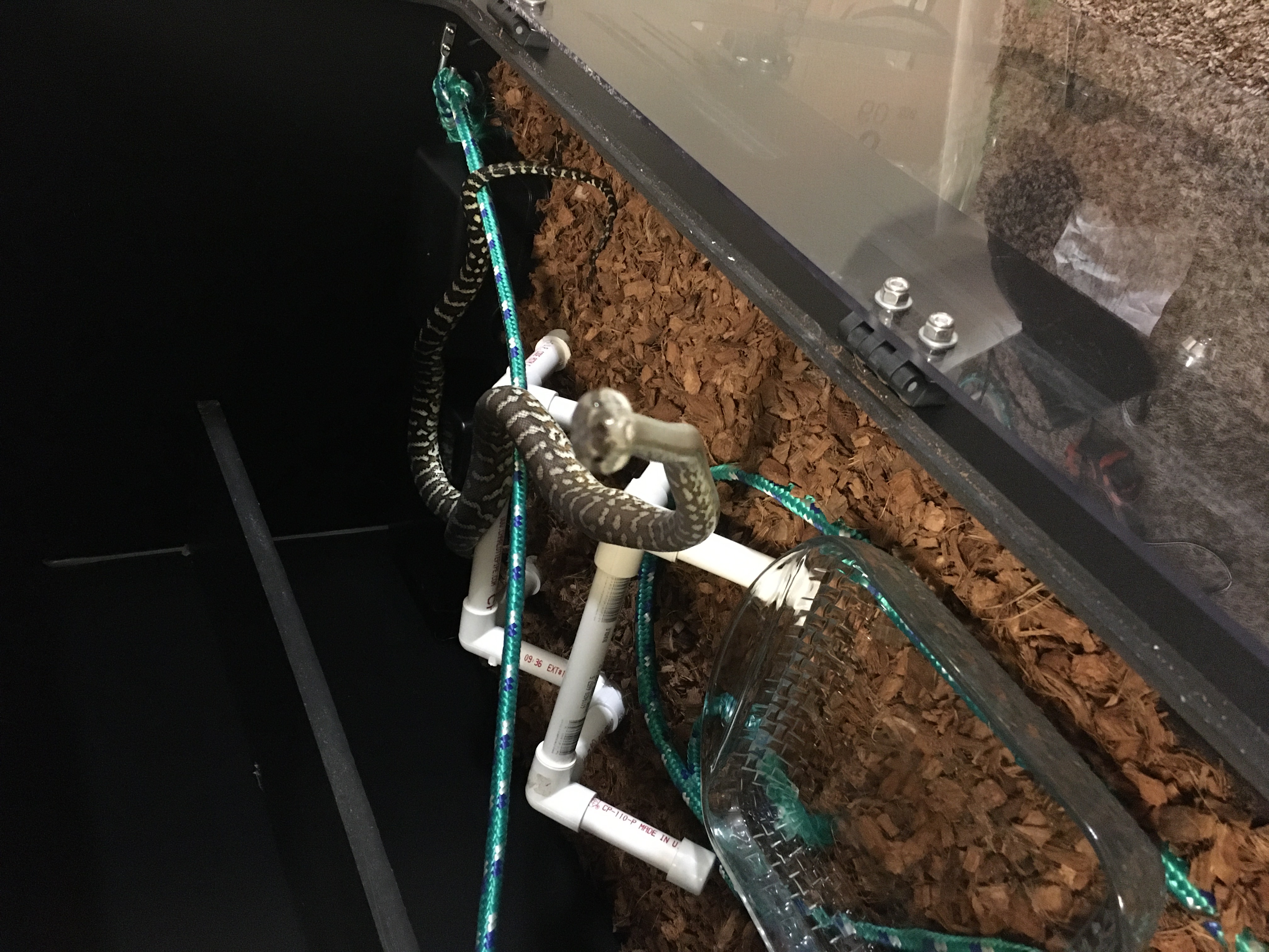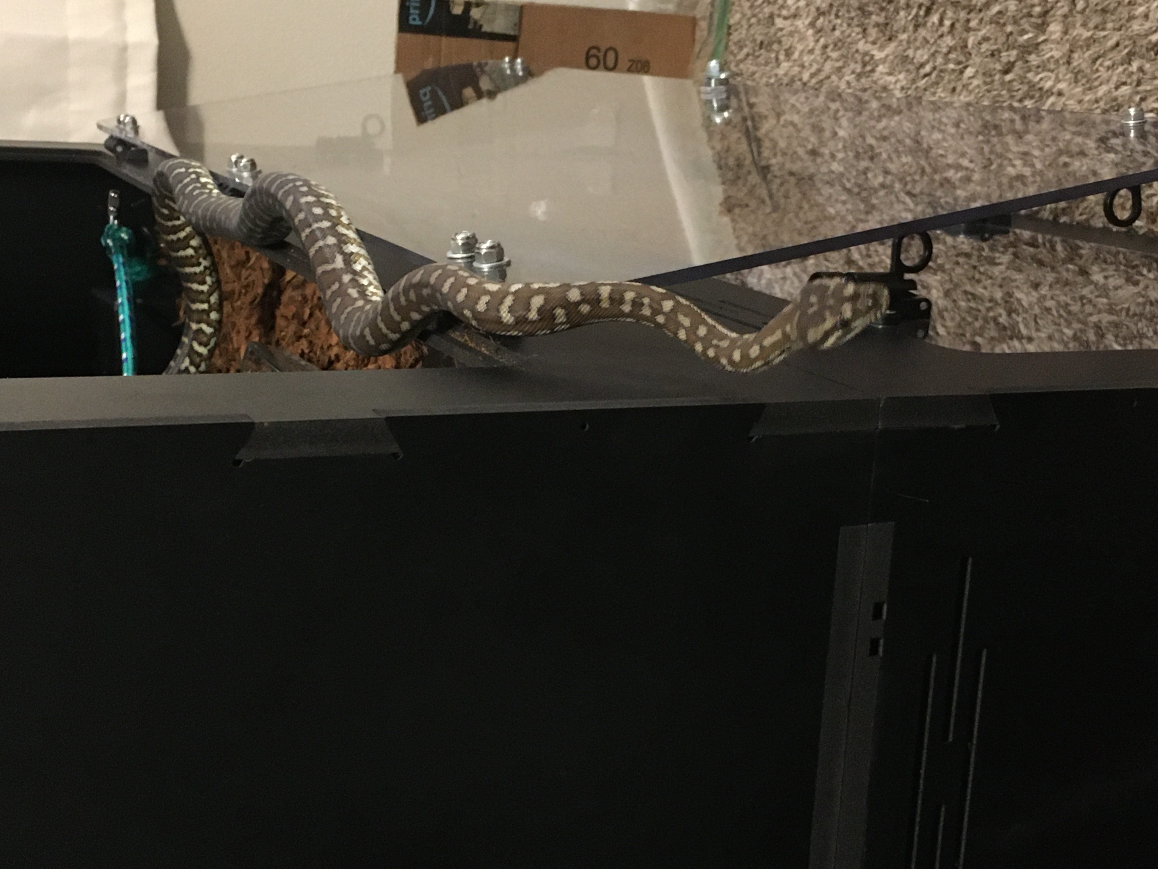 He's about 6ft long now, so it's time for an enclosure extension. I could add another 4' to the length, but I'll get more space efficiency in my room if I instead add a vertical 2x2x4 to make an L shape of this enclosure. Then the external space taken including the bp's enclosure is just a 6x2x4, and Nim gets a more vertical area to climb while also getting a length extension to 6'. The pieces for this could also be reconfigured into a horizontal L shape that provides all 8' of floor space.