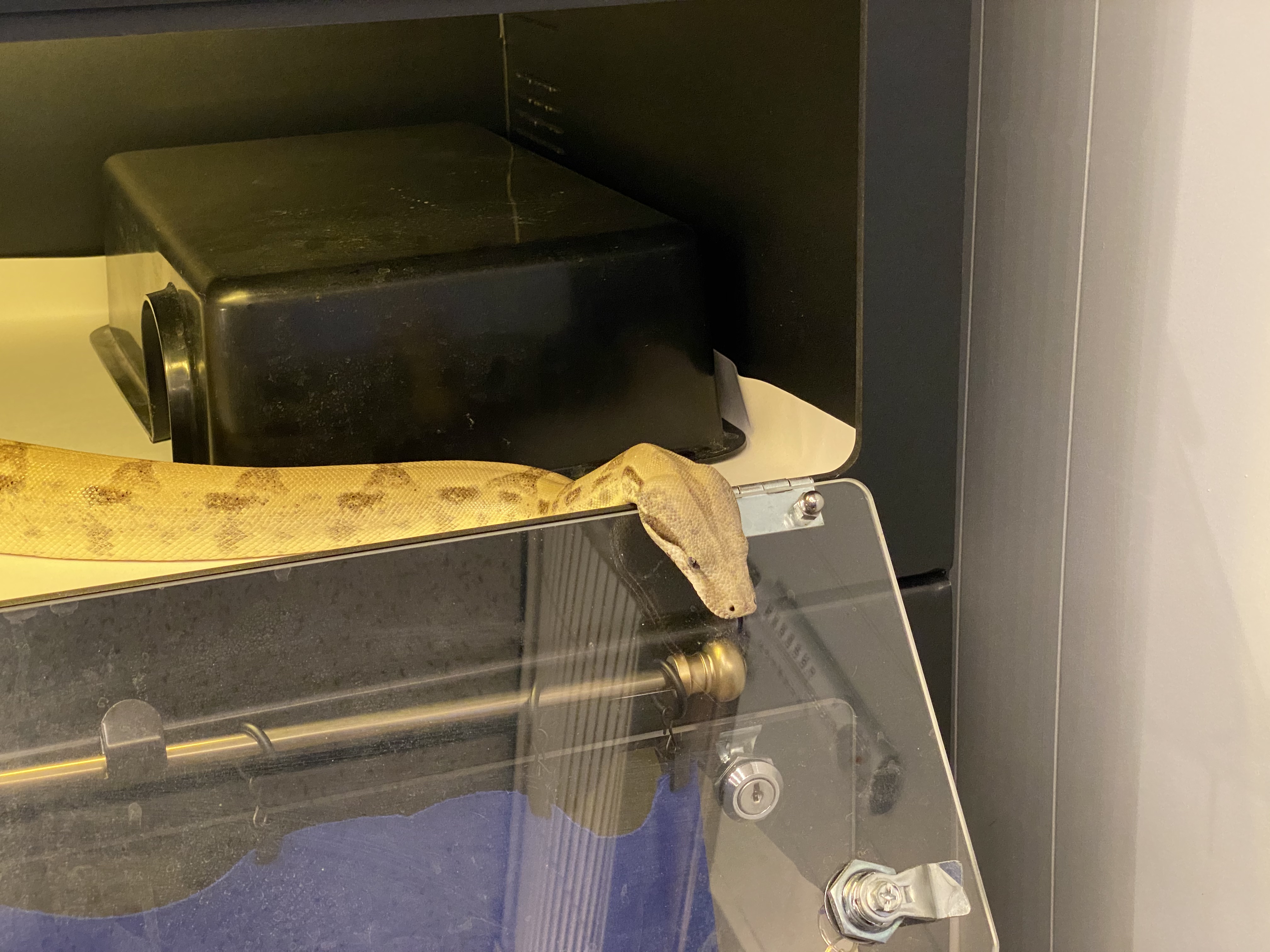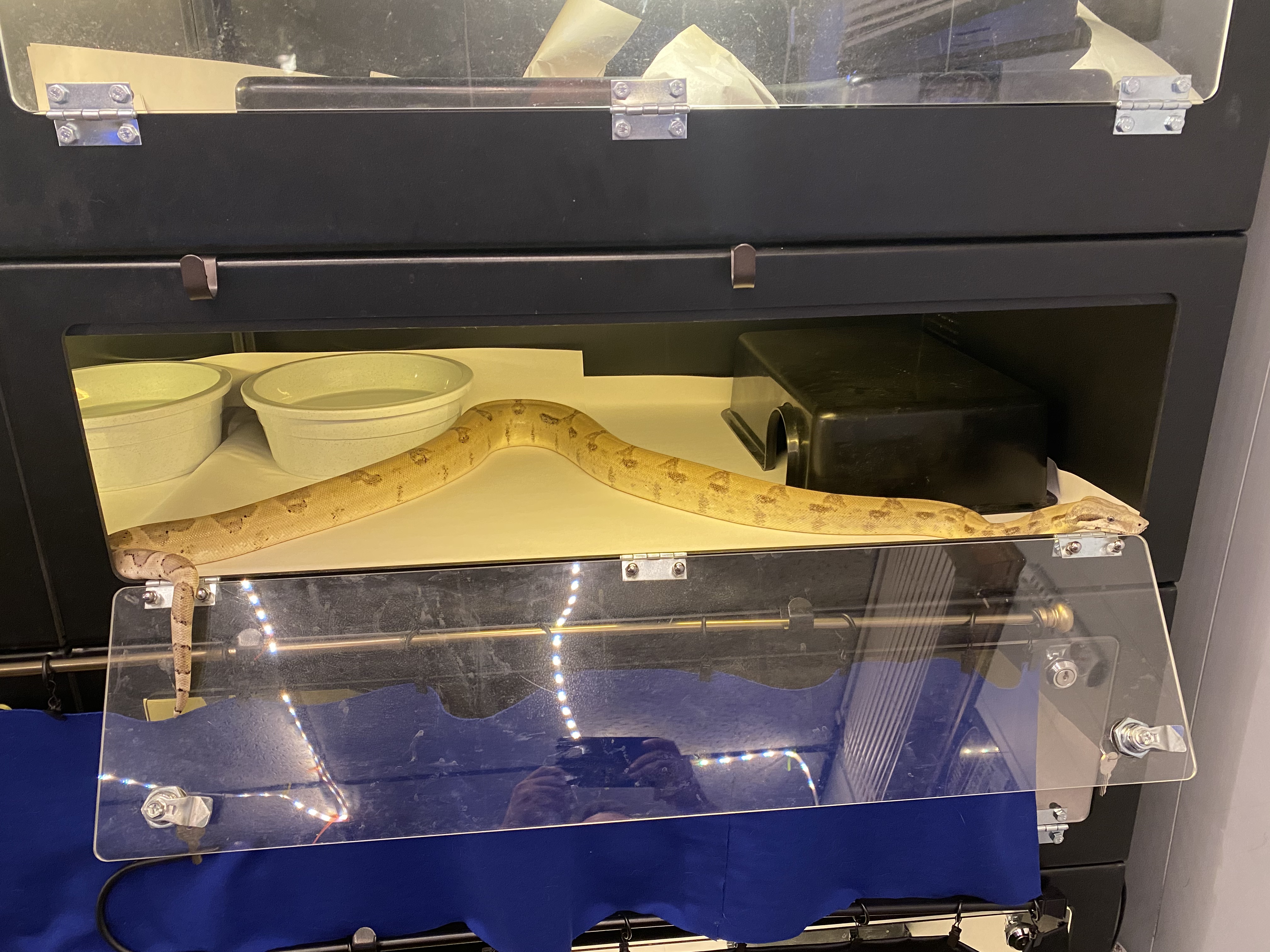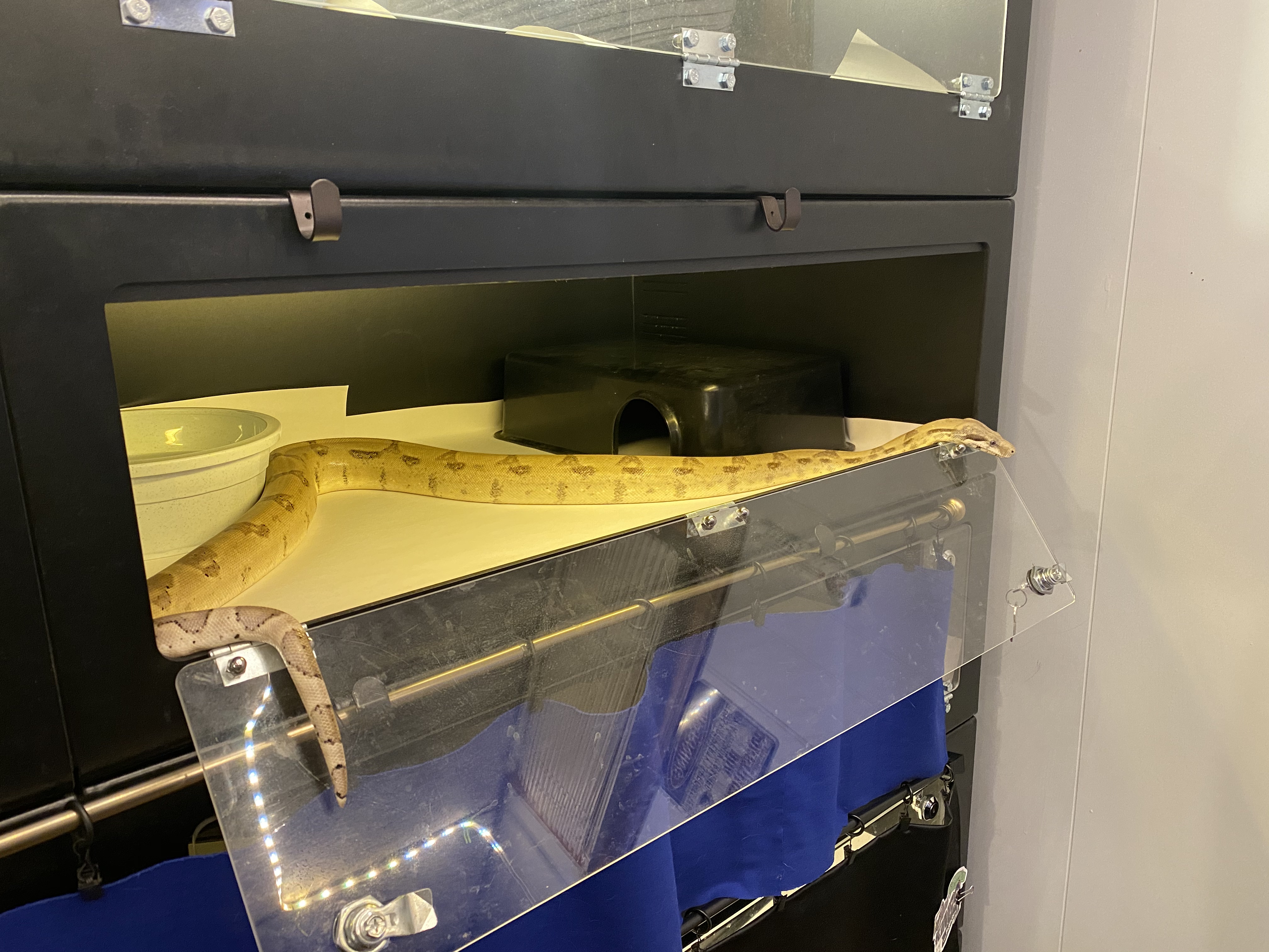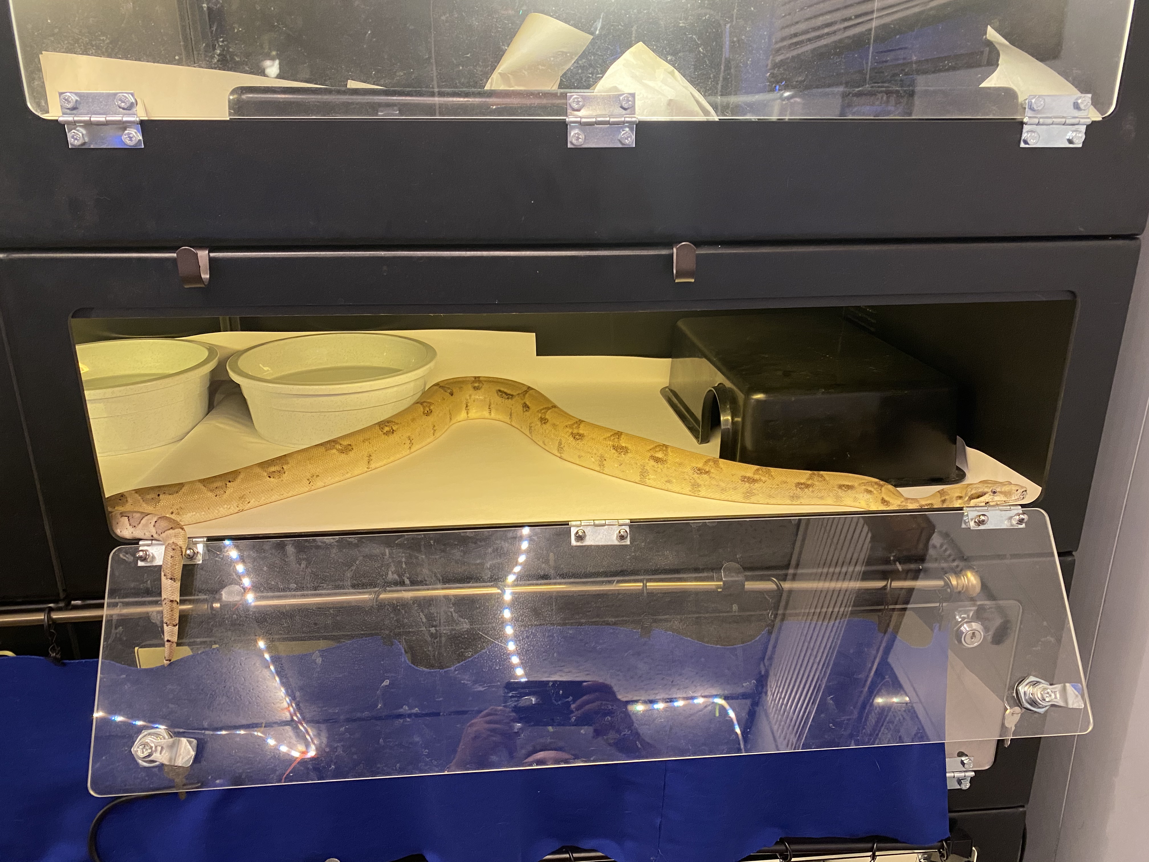 I fed Behira tonight. I had taken out the two smaller hides that she really didn't fit in anymore earlier this week. This leaves her more ground space and hides that are appropriate for her on the warm side and cool side. She used to like to prop herself up on the hot side smaller hide that was towards the front of the tank and strike the doors from there. I am not saying she cannot strike the doors still, and she has from other spots, but she didn't tonight. She was around the center divide and nailed the rat on attempt number one while striking over a foot. I've never seen her strike so far. I usually get the rat pretty close and then she nails it. This time, as soon as the rat was in the tank - BAM!