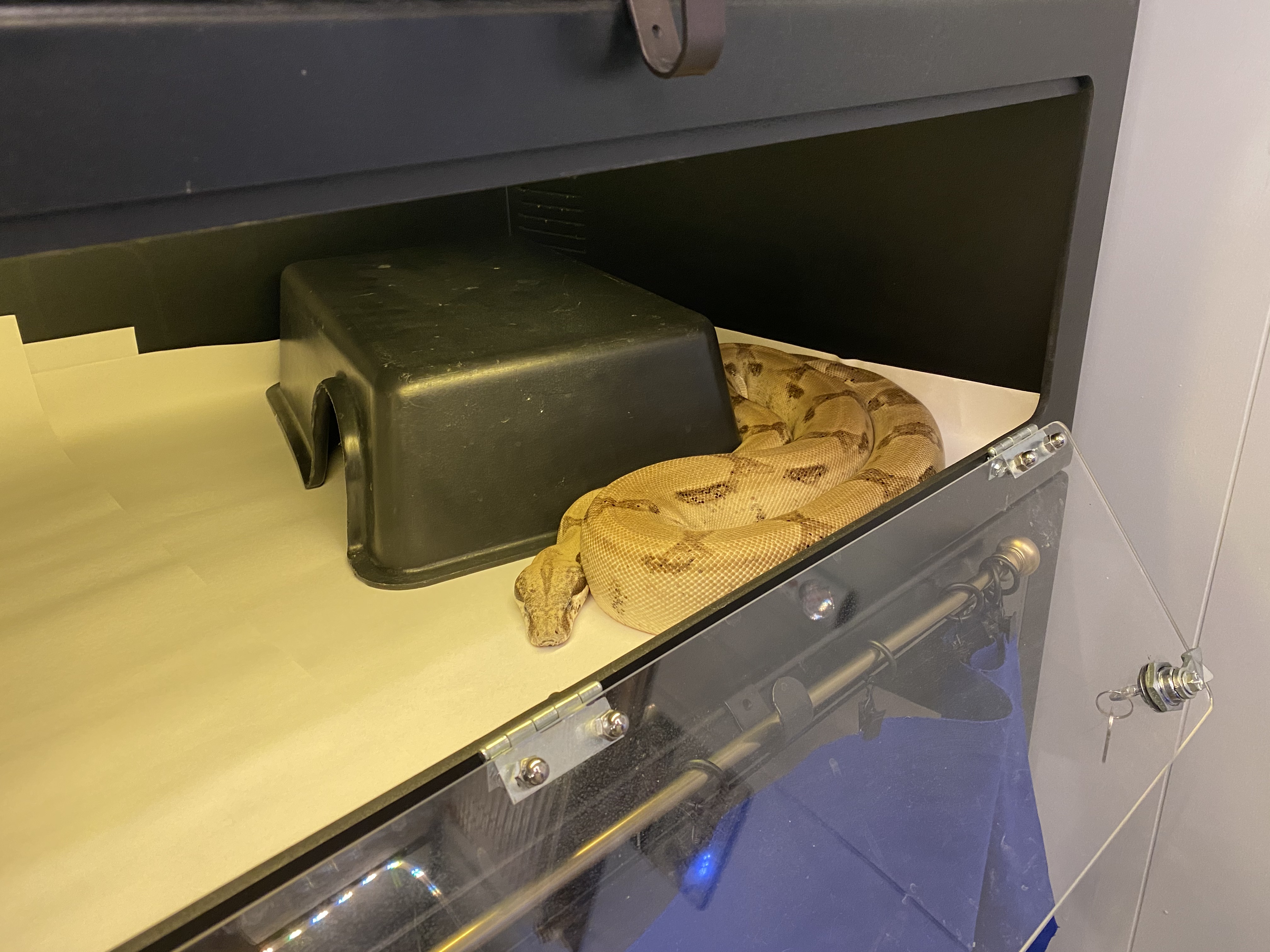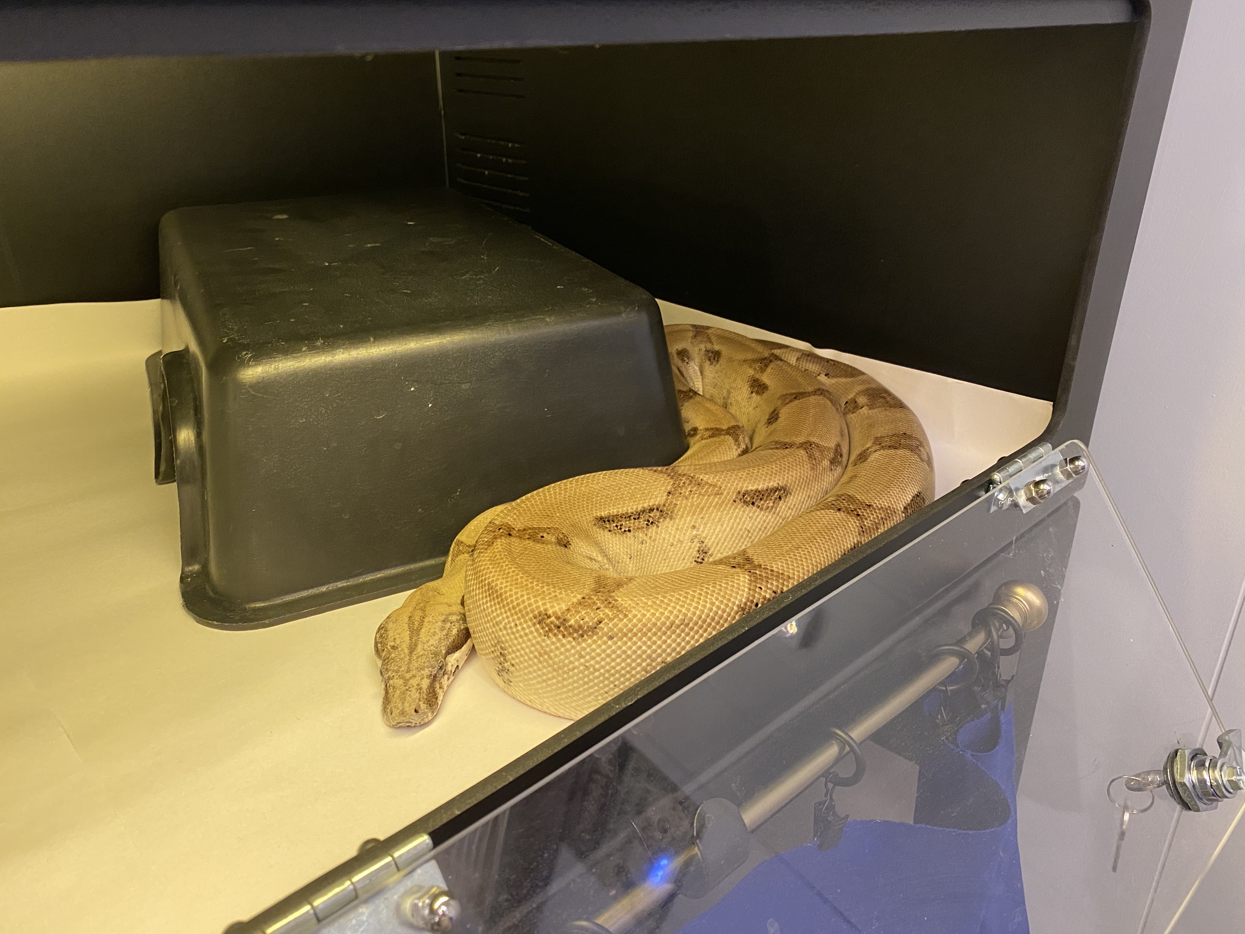 Behira left me a huge present today, but still weighed in at 2,120G. She's definitely growing slowly, but surely. She was about 1,670G at the beginning of the year and was having major shed issues, as many of you know (frequent sheds). Now that the sheds are spreading out, so is her food intake. I am moving her from every 10 days to every 2 weeks, but still medium rats (about 100-130G).