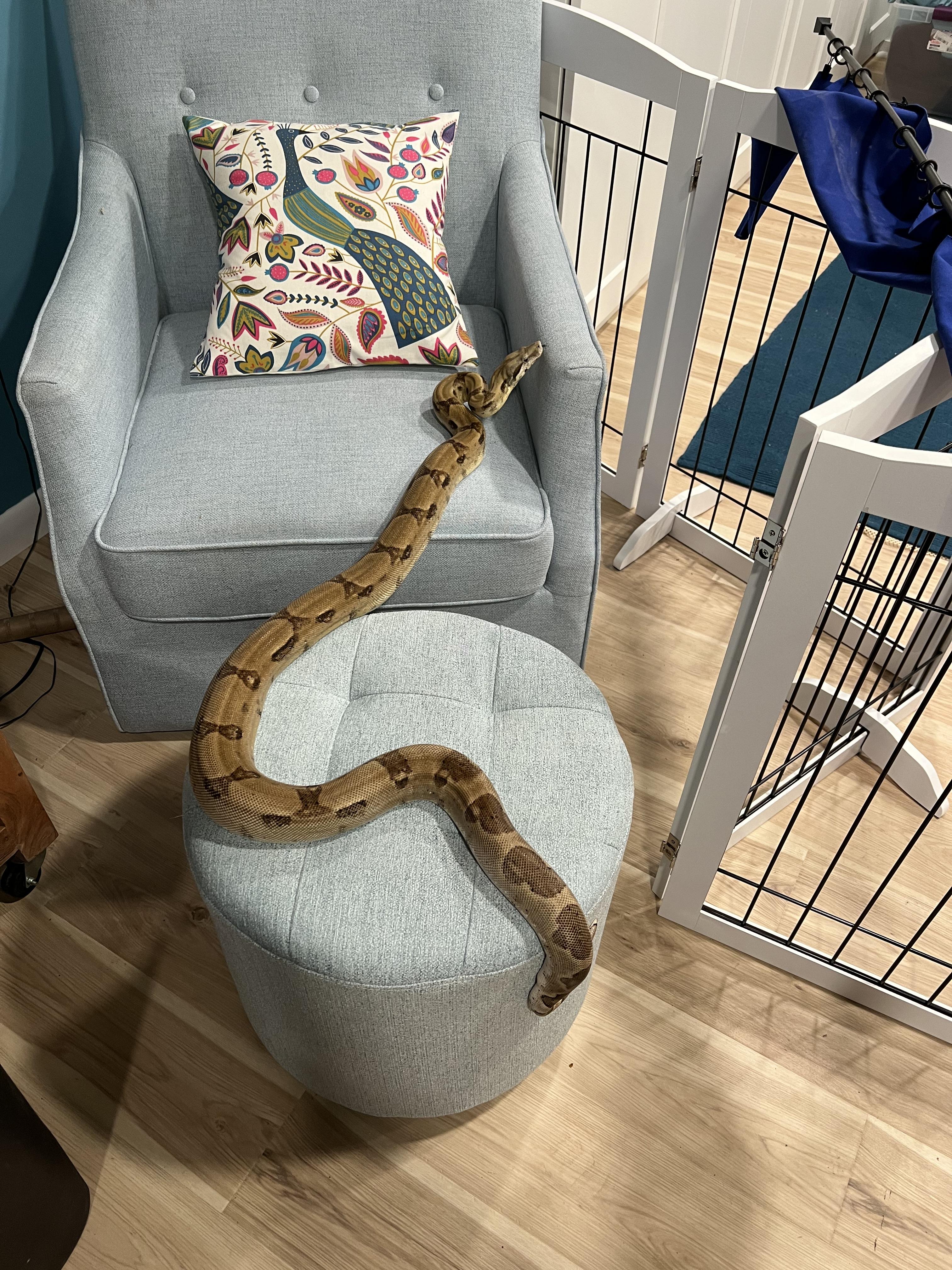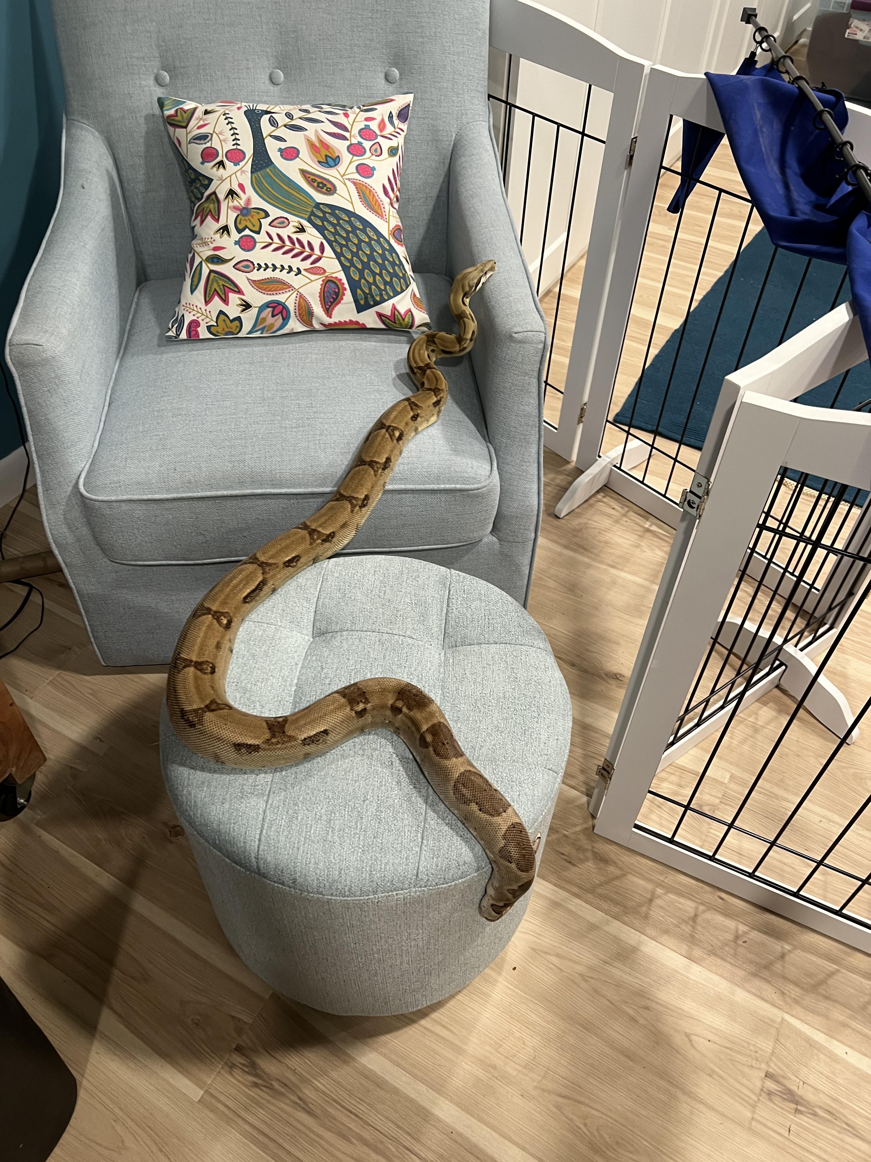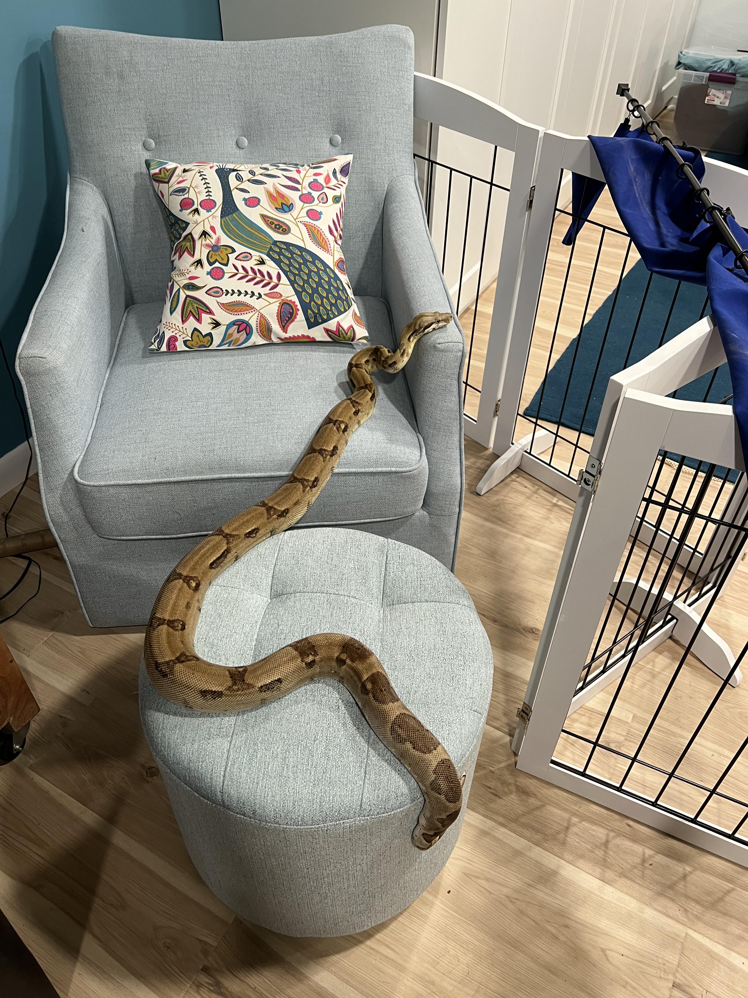 Here's Behira all spread out on the chair and stool in the reptile area. She's really getting some size to her. Still a puppy dog.