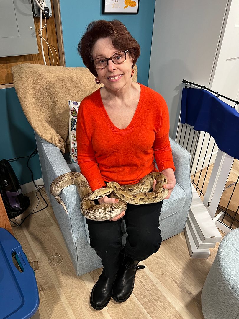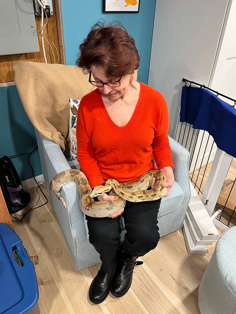 My mom hadn't seen Behira in a bit. She was impressed by her size. She is getting a little nervous as Behira gets bigger, but as soon as she holds her, and realizes she's just a big, gentle, puppy dog, she's fine.