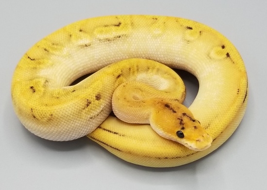 The first is an Orange Dream Enchi Champagne 66% het ghost, being sold by Milbradt & Caponetto Pythons. He's got some amazing colors, absolutely stunning, and is the favorite of the two with my family. Some of the concerns I'd have for him though are that champagne has a tendency to develop a wobble/make offspring with a wobble. I wouldn't want to breed him at all because of that. I also know that ball pythons get less vibrant with age, and I don't want to end up with an adult snake that is just a plain pale yellow.