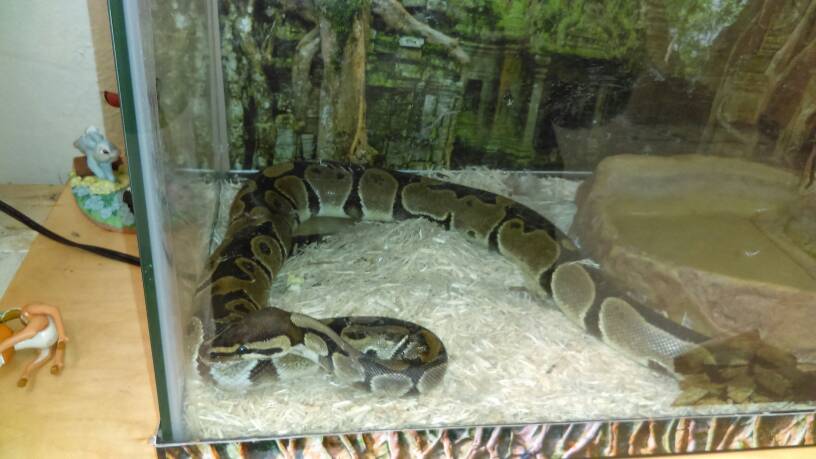 Update on the ball python: like always, she had a terrible shed, i went there during my lunch to help her and most of the shed is gone now including the eye caps (thankfully it was easy to remove them) i also fed her on monday, a small rat (p/k) and she went for it faster than any other snake ive seen, also, because i happen to be class president, i get a little heater for me because the class is really really cold, and i put it far from the "hot" side of her cage and now she is a little warmer, she doesnt feel like a frozen snake anymore