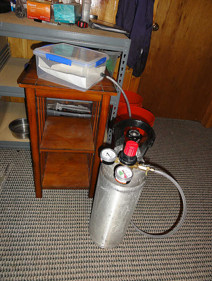 To connect to my 'gas chamber' I use a flexible braided hose connected to a tire valve stem. I removed the core of the valve stem and simply plug the hose right on. I add rodents, cover the chamber with a towel, keep the tank in the basement by the door but put the chamber outside with the sliding door mostly closed, then gas for 20 seconds. I try to keep all of the gas outside of the house. Then I bring the chamber inside, close the door, and put it on a chair for two minutes. I'm finding that if I gas a lot of rodents they start to cool off before I feed them all, so I pop them in an incubator at 110F and pull them out one by one. I also put a paper towel in the chamber because they almost always pee. I really like the little on / off valve that comes with my regulator. That's what I use to turn the gas on and off. If I get an abundance of rats that are just the right size to feed I'll gas them and freeze them. I found that freezing them on a platter in a zip lock bag overnight and then vacuum sealing them the following day works the best. And they all come apart easy when I break the seal on the vacuum sealed bag (don't vacuum seal unless they are frozen!)