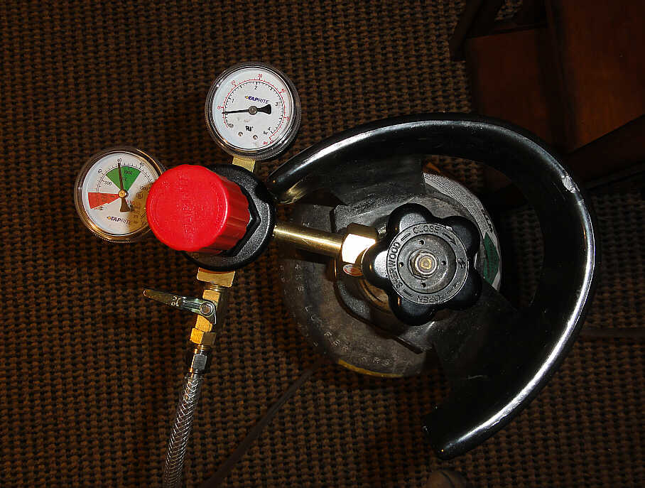 The hose attaches right to the top of the cannister and has a valve to turn the gas on or off.