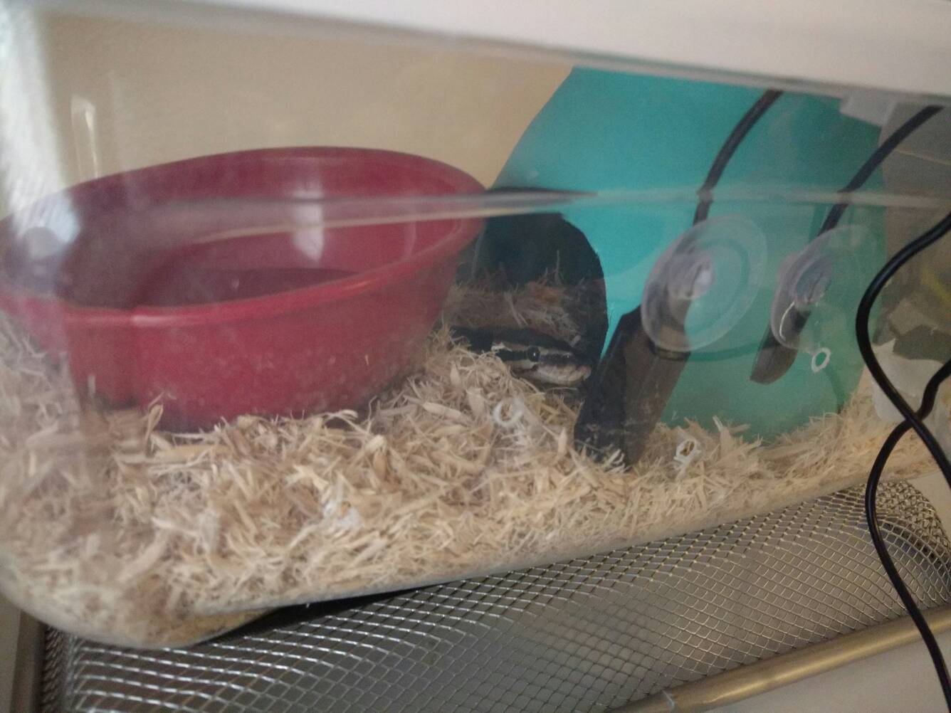 We tried to feed him a live hopper yesterday. He striked once but (we think of insufficient space in the spot at the bix where he striked) the mouse got away. After that he tried striking a couple of more times but he never got him again. The mouse had a head wound though. We took it out and ended it's suffering. Pep was kind of defensive after that and curled up tightly in his hide. The temp is pretty good now we have 84 directly in the box and 86 between box and uth. No more drops during the night thankfully either :) Sooo much easier with thermostat and temp gun!