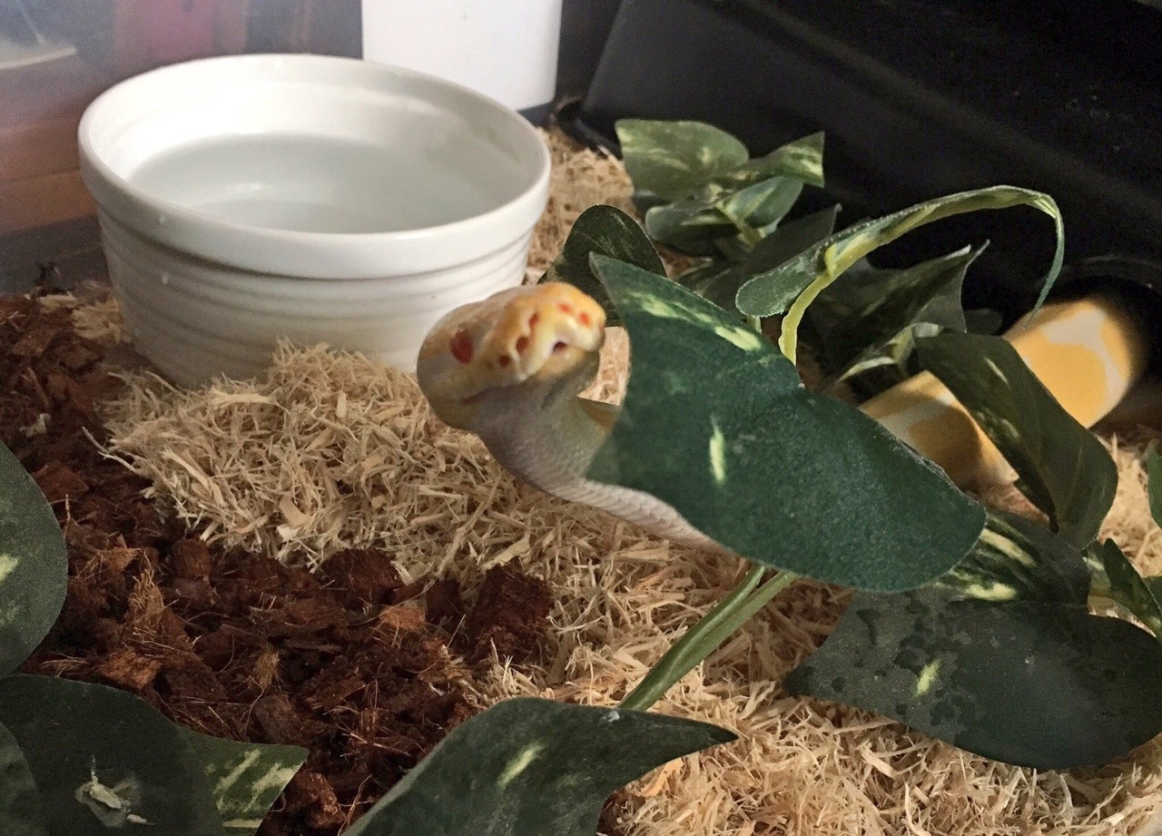 I just switched out half the substrate for coco chips and a new set of fake leaves, and Cake immediately (literally) came out to check out the new things! He actually stretched out looong to stare and sniff even while I was dumping in new substrate and shoveling everything around lol. Fearless booger.