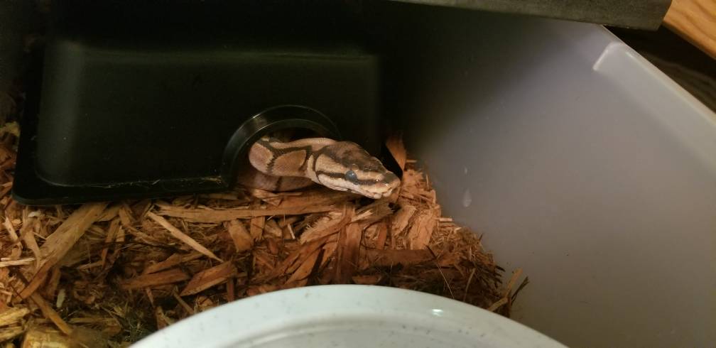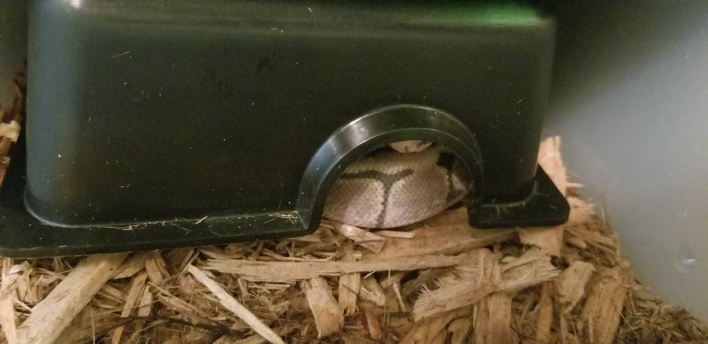 Haha, I actually searched really hard to try to figure out the right size and he still had to grow into it. Spatial things are just not my strength. I really expected him to grow out of it by now, but based on my amazon orders, nope, it's a medium, yes, it still fits. Reptile basics says ball pythons up to 700+g for mediums but nope, he can fit his butt in there just fine. It's certainly worth offering him the medium if you have it, but I doubt yellow's too upset about it. I didn't move mine up early because he likes squishing into it anyway. His first real size upgrade when he was a baby was after he couldn't fit in after a meal. I have a great picture of him with his butt in one hide and his face under another. I go with buy size upgrade early-ish, only swap in once they're wearing it as a hat and look ridiculous personally.