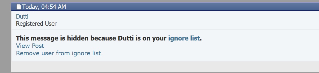 I ask because he greatly upsets me seeing his posts but ignore does not seem to make him vanish from this forum like I had hoped. How do I ensure for example he never replies in one of my posts? I am not being a smartalex here, I really want to know now that you have brought this up numerous times. How do I completely ignore Dutti?