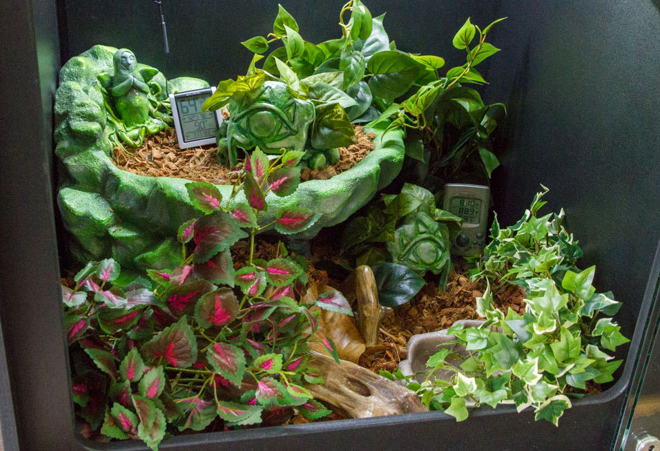 But, I would recommend keeping the snake in an appropriate size tub that is simply placed inside of your decorated display enclosure until it nears adult size in about 2 years. Either way, the most important necessity is a good, reliable thermostat to accurately control temperatures and I highly recommend underbelly heat tape (such as THG) over heat lights...