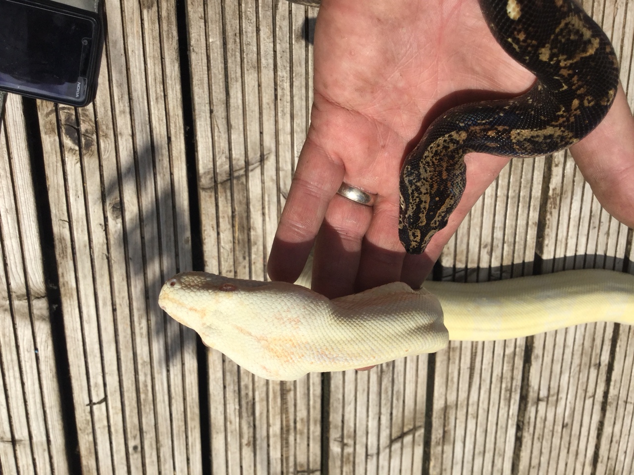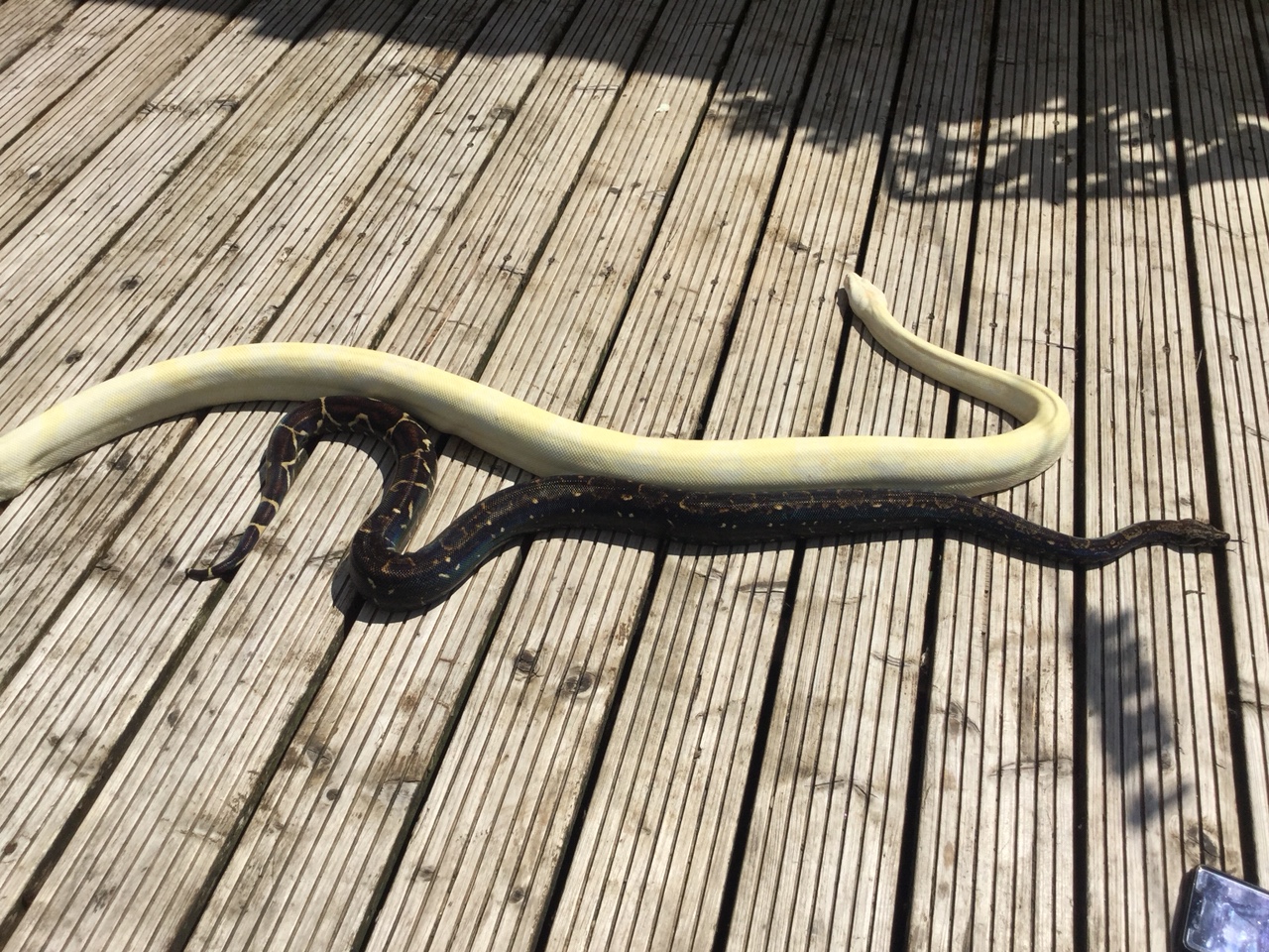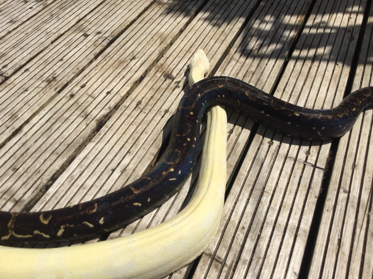 I had my Kahl albino and my Hypo img out for a few photos this afternoon to show how dark she is getting, Kahlos is 10years old and my Hypo img is 2.5yrs old , they just wanted to crawl about on the deck and would really keep still, they kept putting the tips of the tail in between the cracks for some anchor