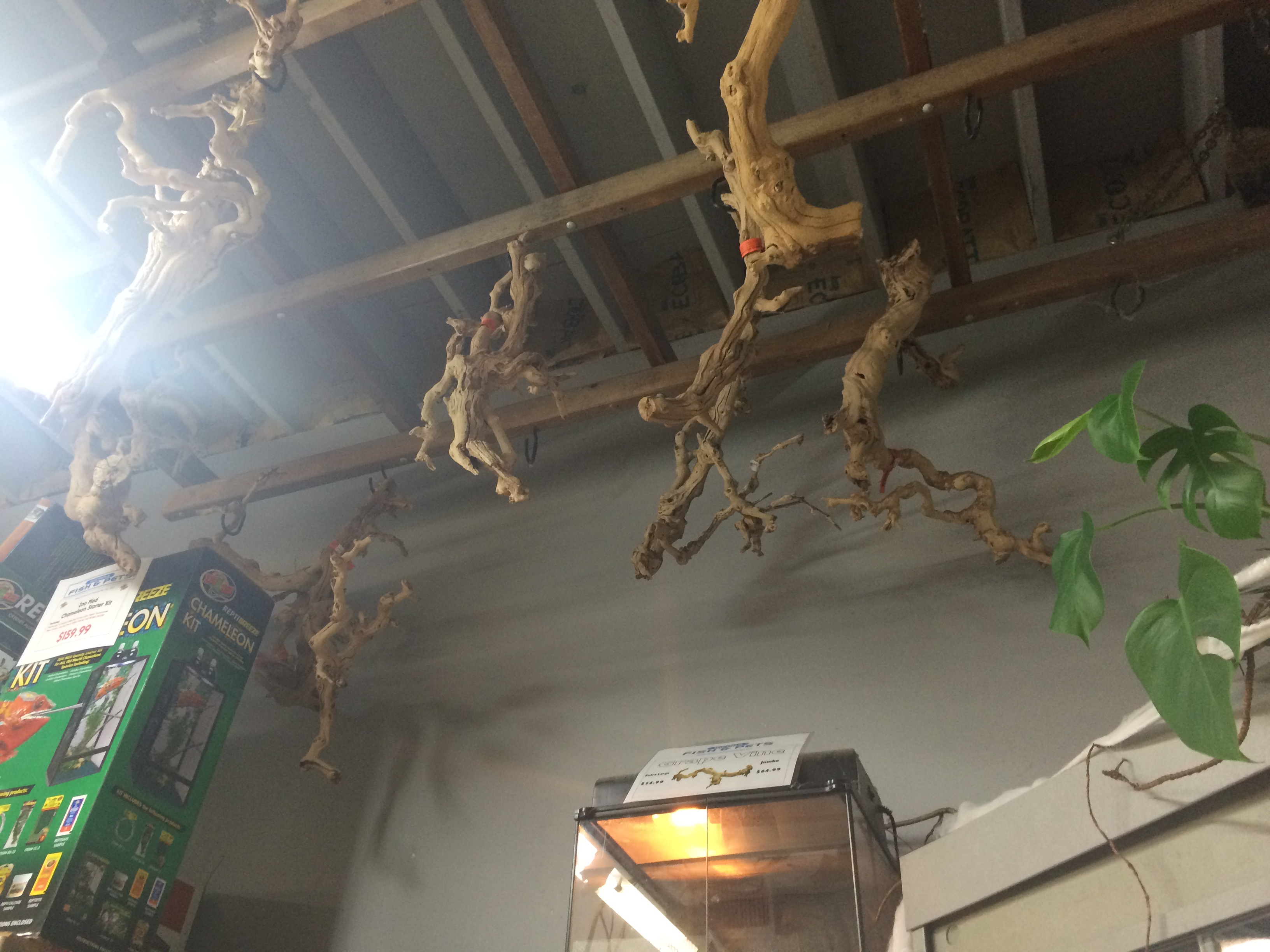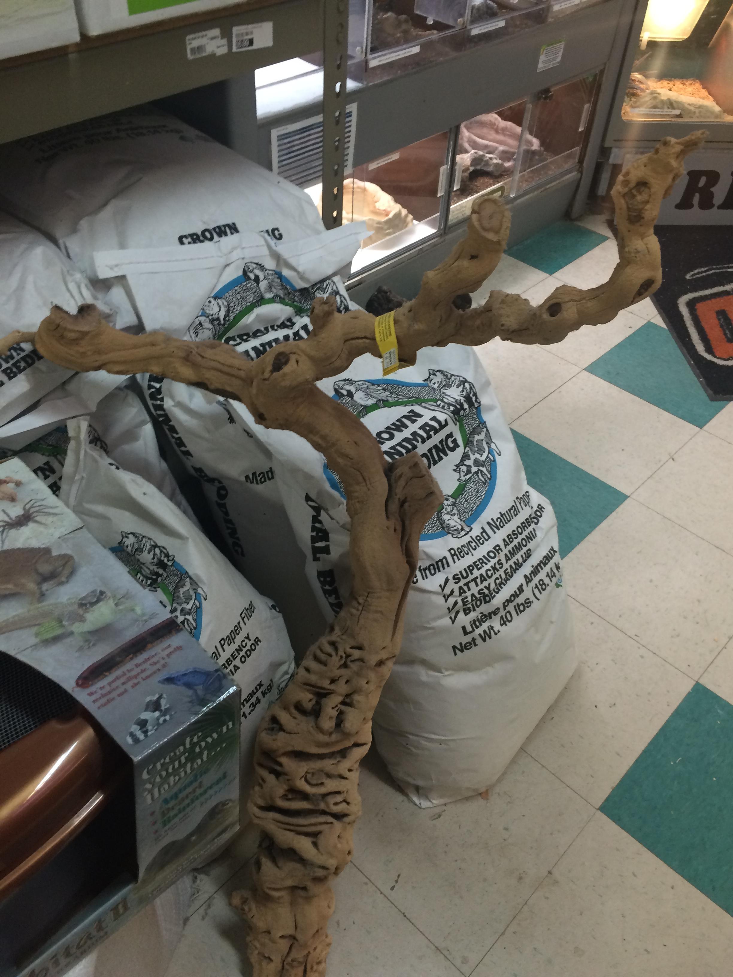 It's illegal in CA to collect driftwood without permission or unless posted. The wood I use is grapevine I've bought at various reptile shows over the years. The perches are either wooden dowels or pvc pipe (which I heated and twisted).