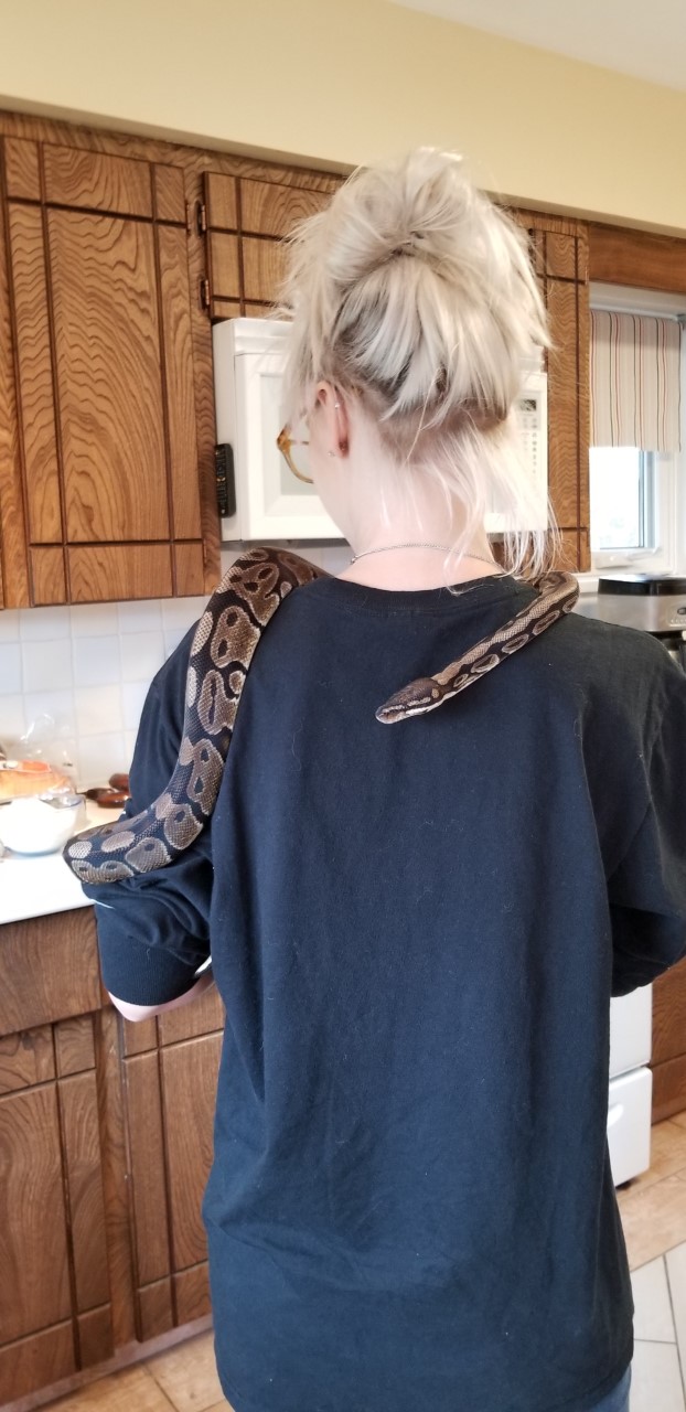 She spends a lot of time in her hide, and when I take her out to hold her, she likes to sit with me for a bit, then is keen to explore and find a place to burrow. She likes to burrow behind pillows on the couch, or directly behind me. I had her out last night and felt horribly guilty because she was obviously stressed, probably because of where she is in her shed cycle. The guilt ate away at me I felt so terrible. Going forward, I will leave her alone until the shed cycle is complete. Once the shed cycle is complete, I plan on feeding her her first rat.