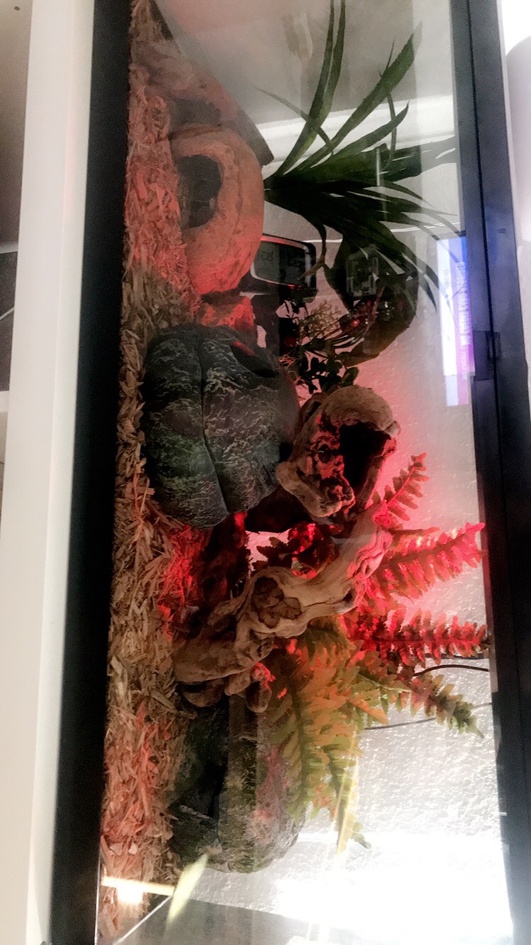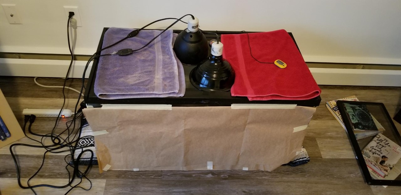 under the right side there is a heat pad (thermostat controlled) and then on top of the middle is the heat lamp. The left side top is covered with plexiglass to keep the temperatures and humidity in and on top of plexiglass I have a small humidifier that’s constantly running to keep the humidity at 60%