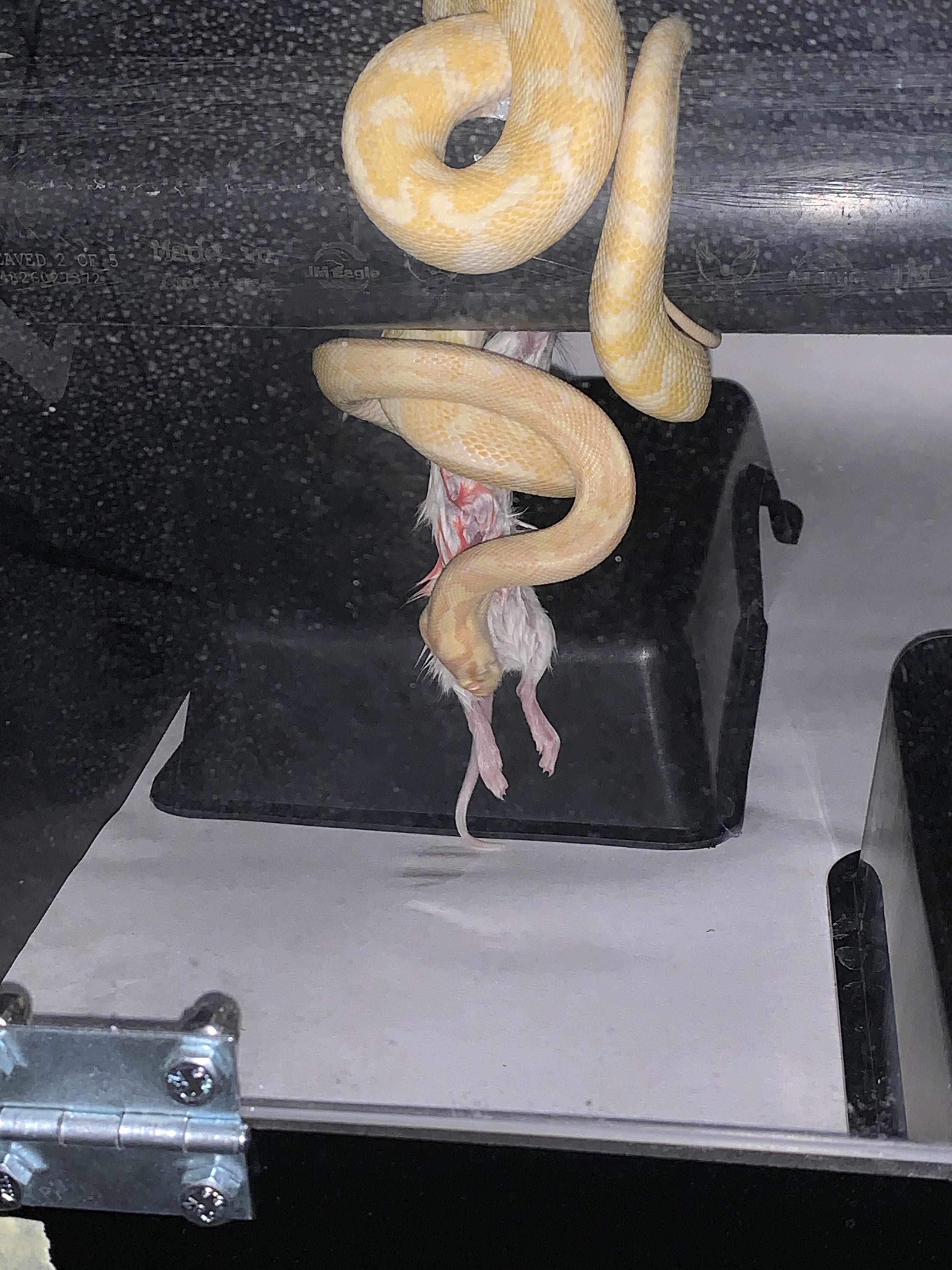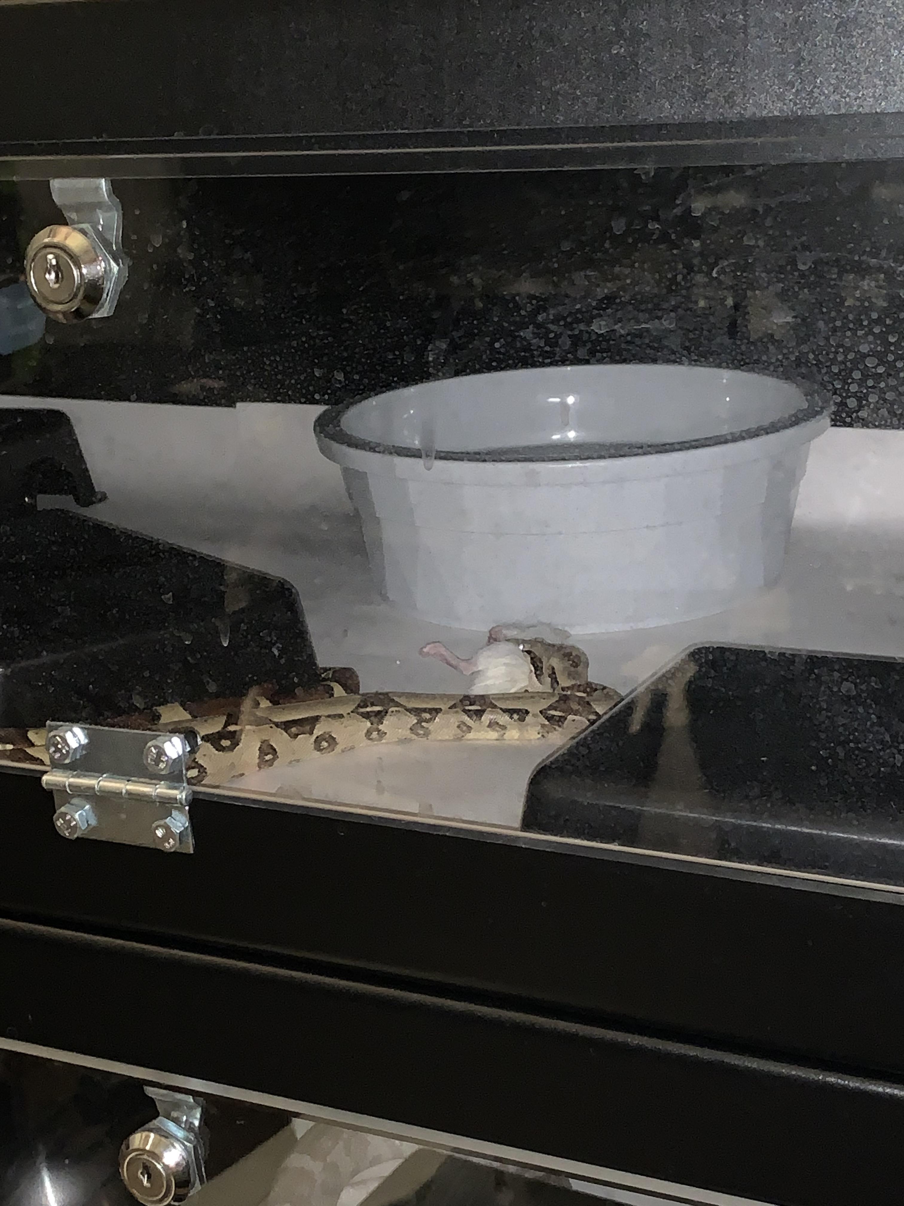 Yafe (albino Carpet Python) and Feliz ( dwarf BCC) each got their biggest meals yet (weaned rats at 30G and 34G respectively).
