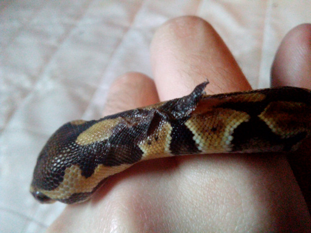 My ball Python, Noodle (Noodle K. Doodle), did not feed since birth to the point where assist feeding was necessary. However, they have started strike feeding with no enclosure changes (they've always had three hides, a water bowl and a heat-safe caged lamp). As a result of this, however, Noodle has always been a bit underweight, especially in the early days. They're catching up now, but they still had saggy skin around the head and neck. And here is where the problem lies.