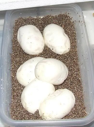 See, I thought that the verm was too dry. It does not feel like you can wring it out or anything. I know why the eggs look so moist though; condensation was/is forming on the dead eggs, and the one that you can see in the bottom-right in the first pic, actually has a pool of liquid on one of its dents.. not sure if maybe it got a small hole, or if it is just from it being rotten. This is definately not from condensation in the tub, because the inner lid is bone-dry; this was my first thought, but no water has dripped from the tub lid to the eggs. I have decided to throw them out and keep the one that still looks good. This is a tough choice but I am not going to be incubating dead eggs thinking they will live. :(