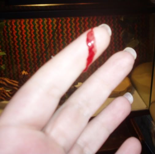 tagged by our boa rescue....I was holding her door open with my right hand and had the misting bottle in my left hand....I was using my middle finger in the trigger and had my pointer finger poking out like BAIT!!! :P