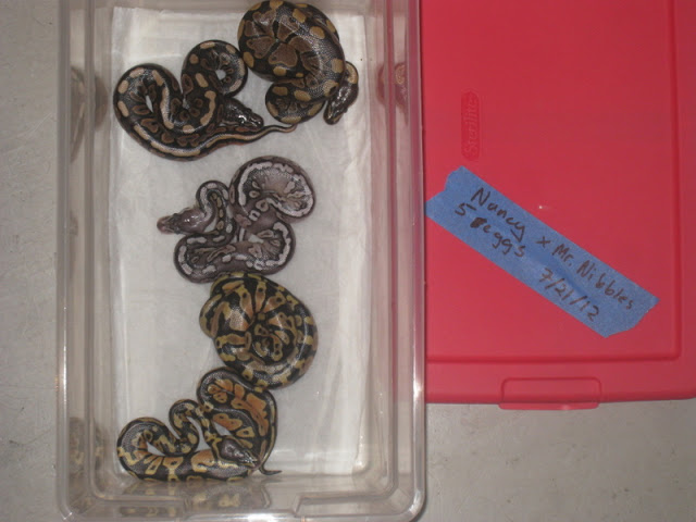 Just hatched 5 eggs from a pewter x 100% het pied pairing. I used a 2008 het pied male because my visual pied male was a teensy tiny 2009, and he already seemed confused about the other two pairings I had him in. I didn't have a lot invested in this clutch, it was just something to do with the pewter.
