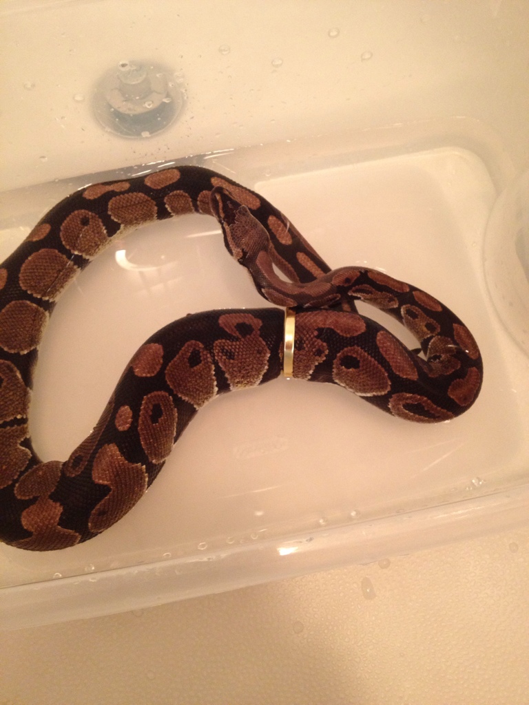 the thermometer had fallen off the tank and i guess it had a metal ring around it, which somehow, my snake, Snake Gyllenhall, had crawled through. It was stuck around him and i was freaking out at 5 a.m. I tried to get it off without hurting him. i could tell it was really bothering him. I ended up getting scissors and cutting it off but it took me a while. Has anyone seen something like this before? i was tempted to call the company and complain because I think it could have hurt or killed my snake.