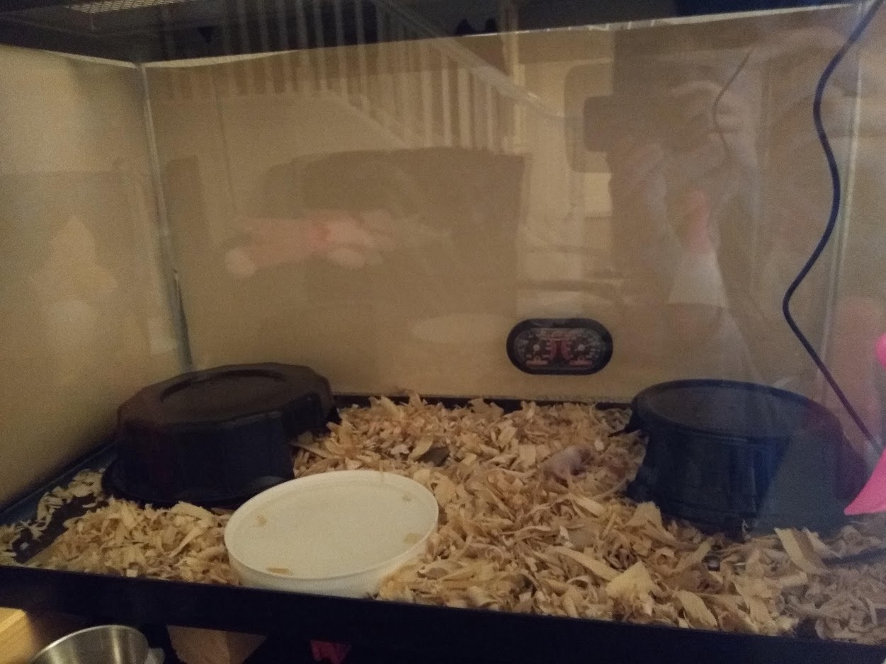 Here's a pic of the enclosure. (water dish has some aspen in it because some fell in) (heating mat is on right side of the tank (below the right hide, set at 91 degrees) (also the BP is under the right hide right now, with the mouse that i left right outside)