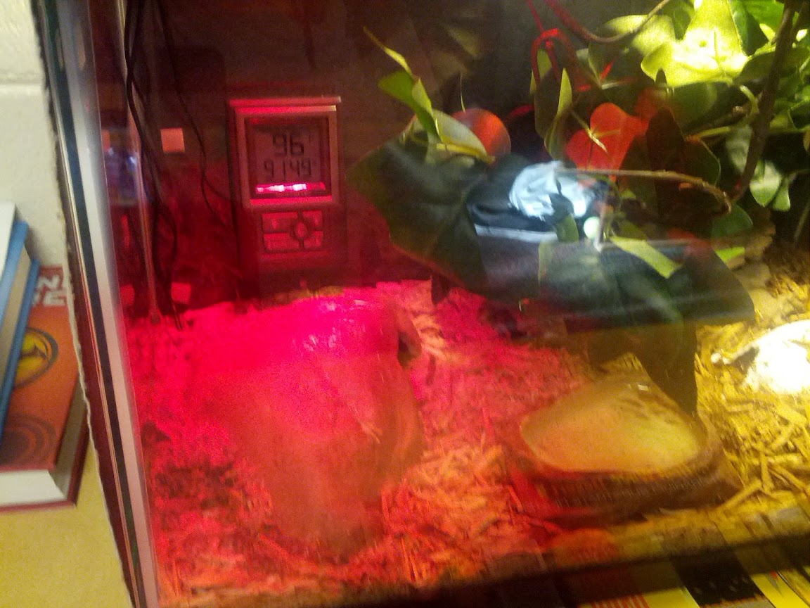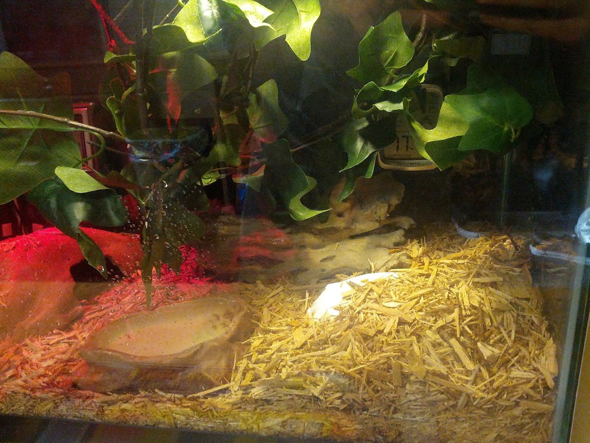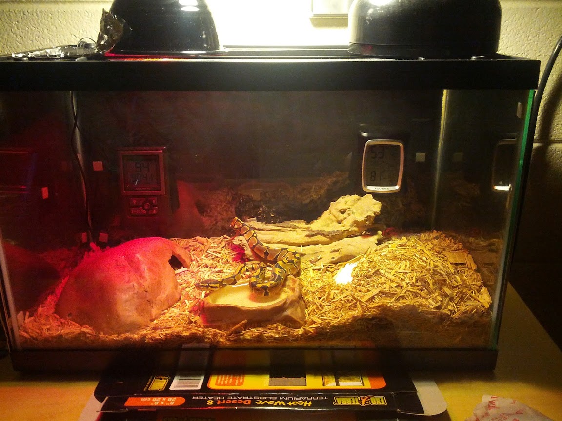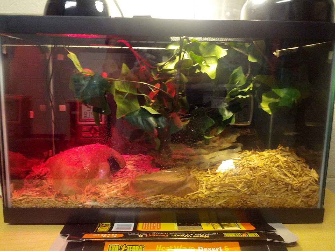 My set up is below, the hot side is always 90-92 degrees with 43-50 percent humidity, the cold side is 78-81 degrees with 53-60 percent humidity. He has a hide over the heat pad which is being measured by the thermometer probe (94-96 degrees) and a hide on the cool side that is partially buried. He uses the hides during the day but seems to like slithering in the vines at night. He always looks like he is trying to escape. I fed him last night after he was in the vines and he hit the mouse right out of the tongs Last time I had to lay it on a log and he just slowly went up to it, smelled it for a few minutes, then slowly grabbed it and ate it. Now he has calmed down, maybe he was just hungry? I have only taken him out twice and have done everything I can not to stress him out. He just seems like he likes to explore. Crazy guy.