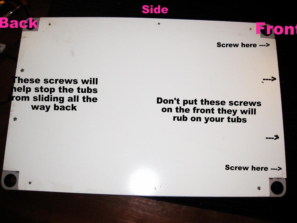 3 screws down the sides and 2 screws on the front and the back are enough. Just make sure you put the screws on the front next to the posts so your tubs don't rub on them.
