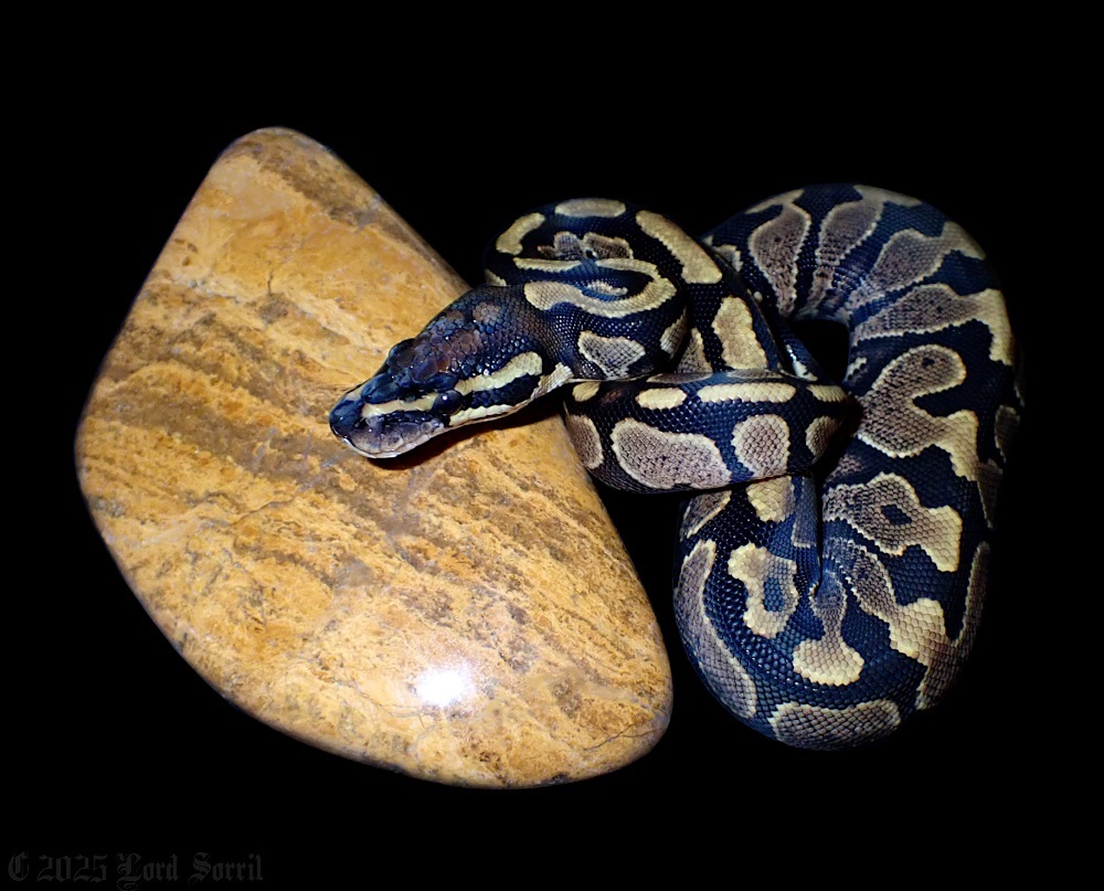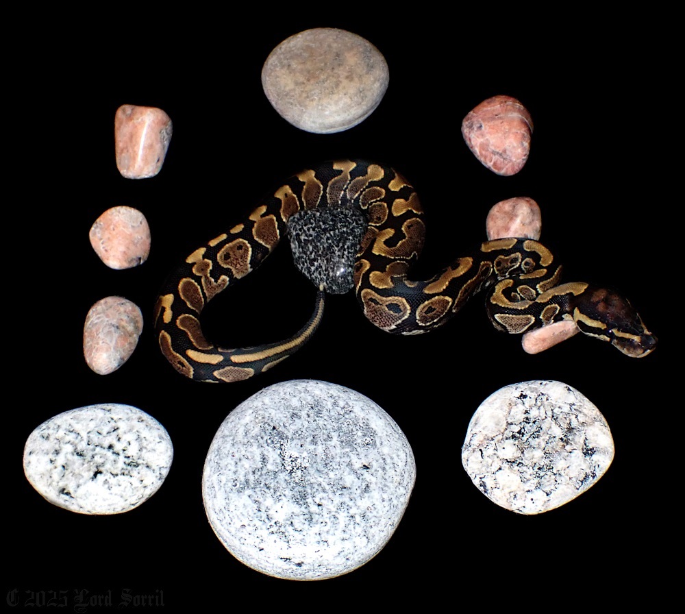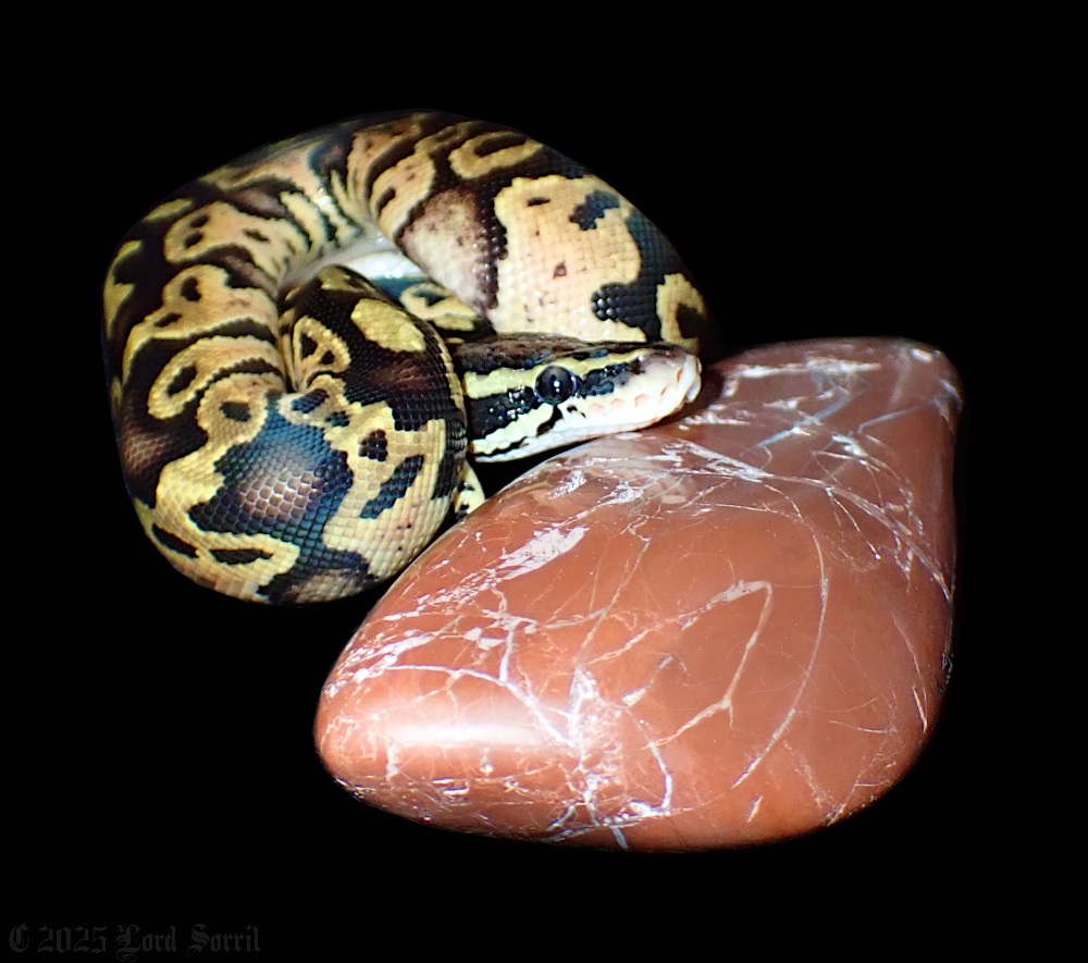 BP = Enchi/Het Albino/Het Gravel or Yellowbelly. Stone is a tumbled/polished piece of Tiger Iron from India.